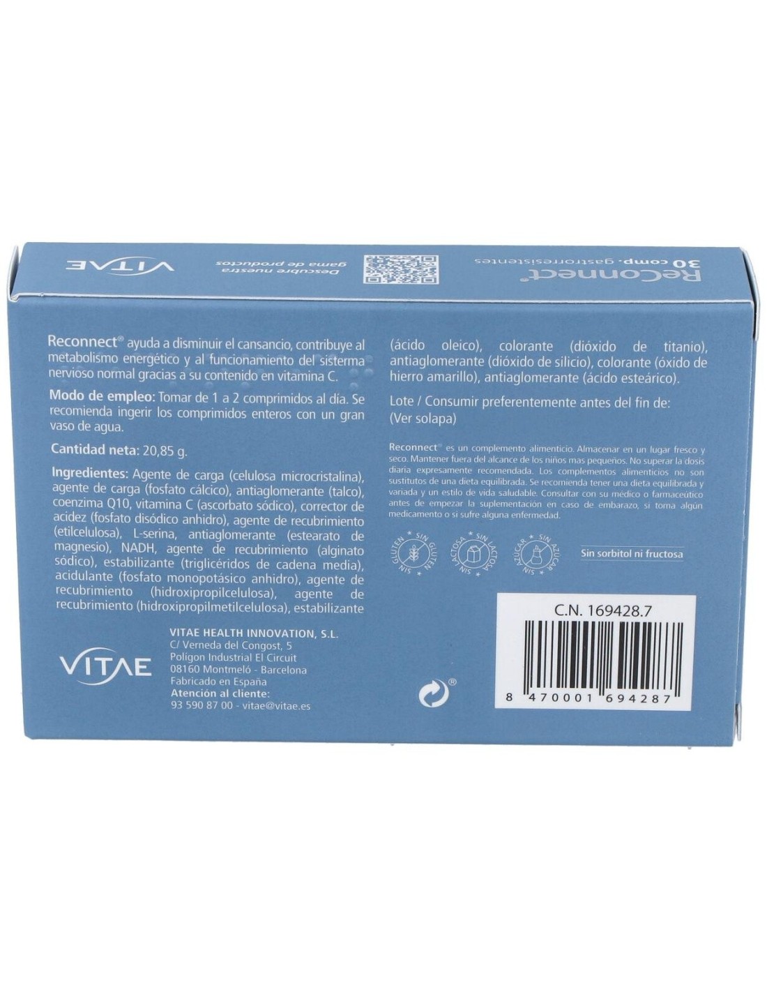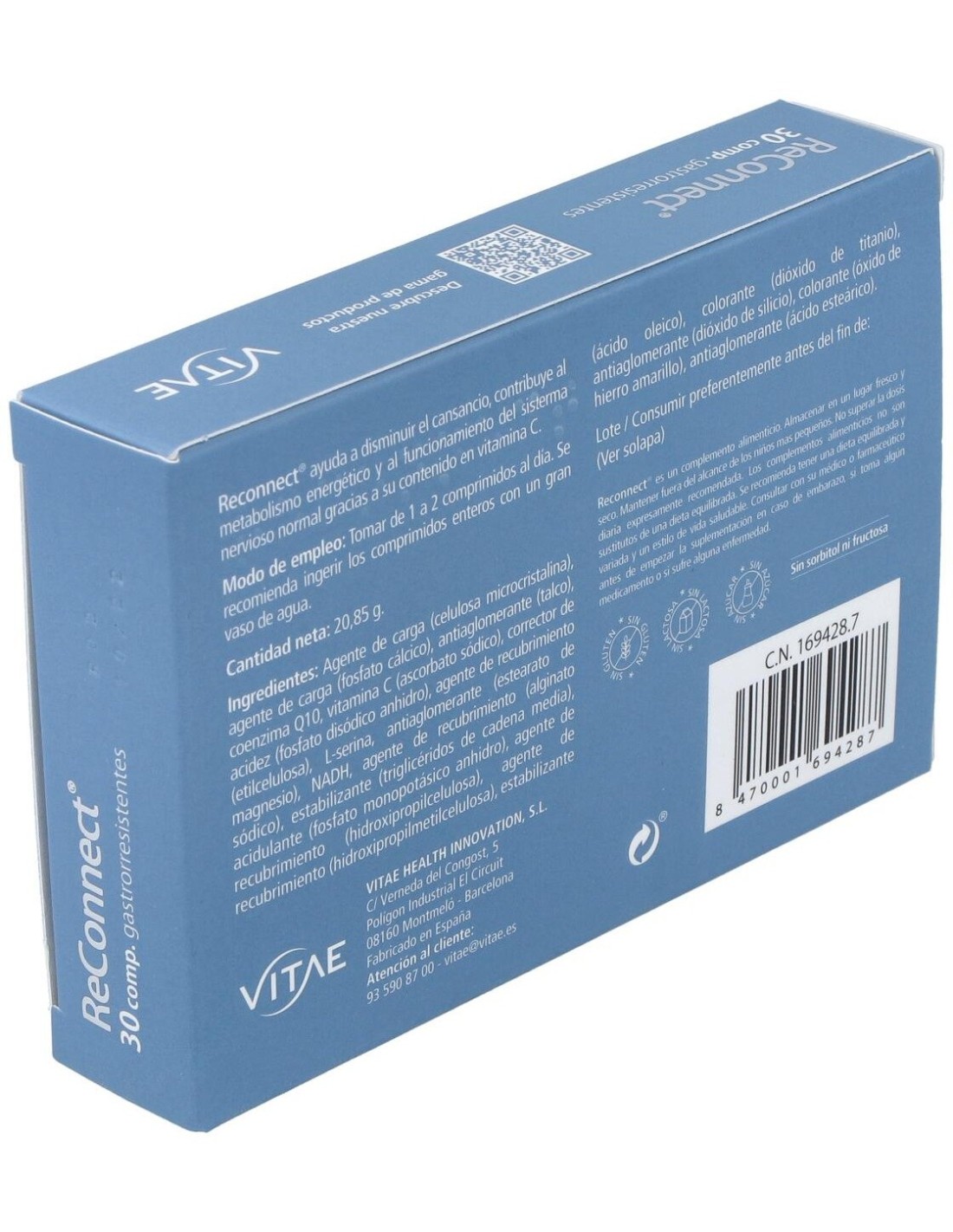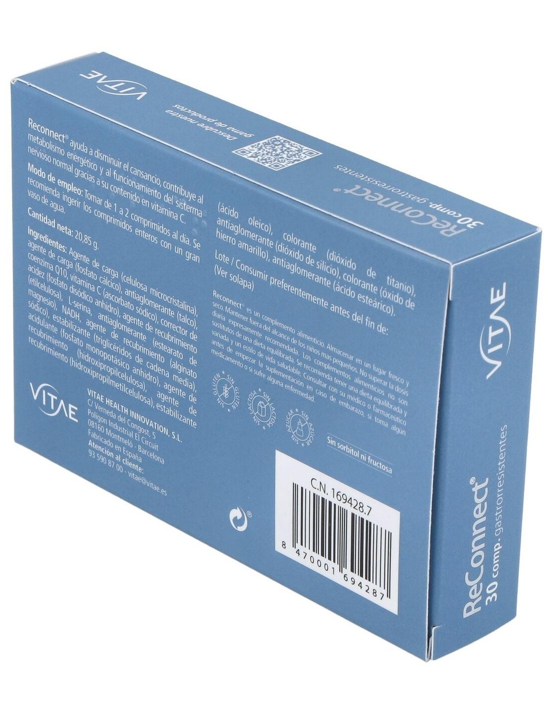 ReConnect de Vitae es un complemento alimenticio que contribuye al funcionamiento normal del sistema nervioso, la función psicológica, al metabolismo energético normal y a disminuir el cansancio y la fatiga por sus ingredientes, contribuyendo así a ayudar al organismo a afrontar el día a día en épocas de estrés, cansancio o alta actividad. Son pastillas para la memoria y la concentración.Tanto la CoenzimaQ10, el NADH, la vitamina C como la Serina, tienen fisiológicamente papeles fundamentales a nivel tanto metabólico como cognitivo en el organismo debido a su implicación en el sistema energético del mismo, entre otros. La vitamina C por ejemplo actúa como antioxidante y la Serina juega un papel esencial en la diferenciación y maduración de las neuronas y en la formación de la vaina de mielina que las protege y acelera la transmisión de impulsos, imprescindible para el rendimiento cognitivo.Princios activos:
