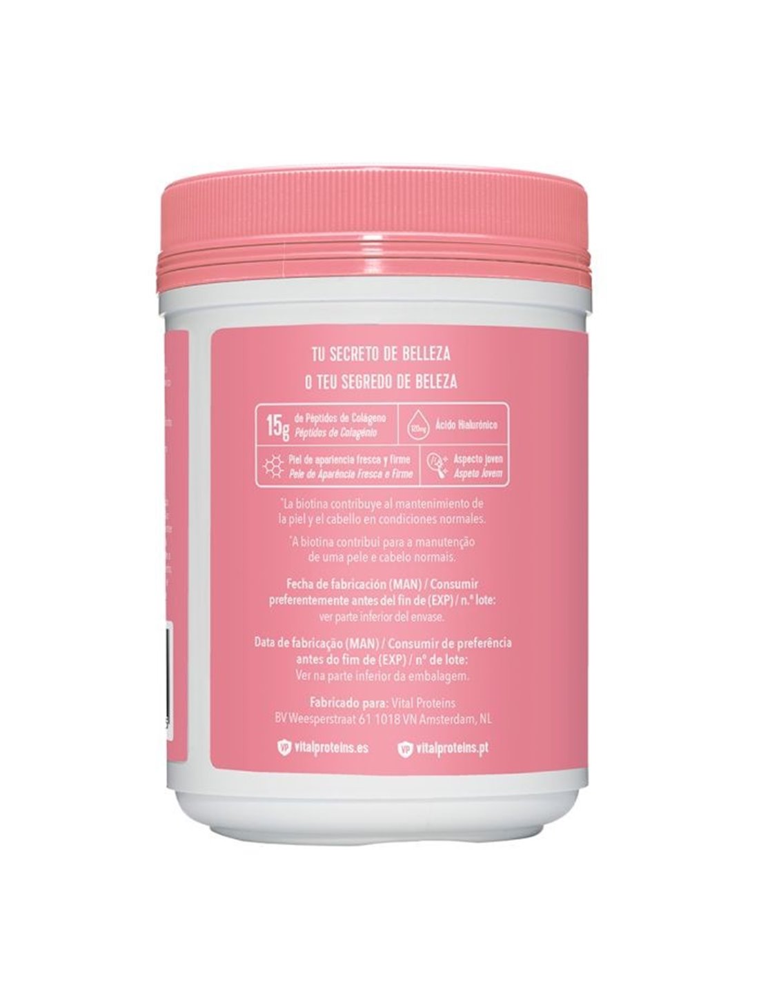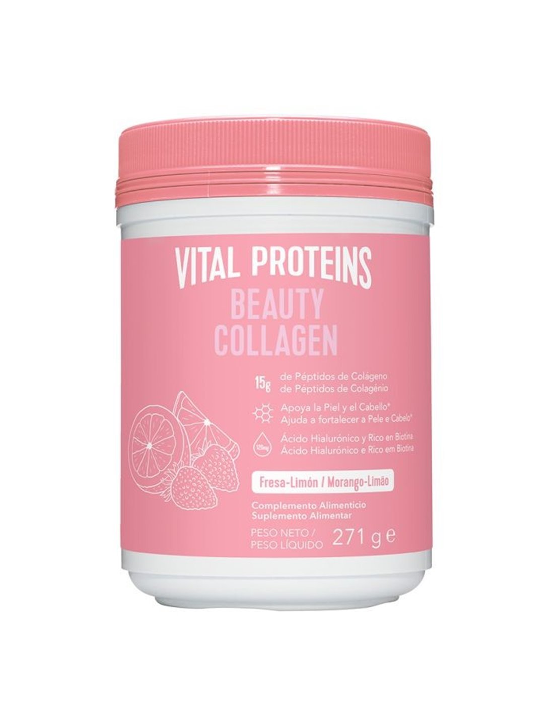 Vital Proteins Beauty Collagen está compuesto por péptidos de colágeno, ácido hialurónico y biotina, Los péptidos de colágeno de Vital Proteins se caracterizan por tener un alto nivel de aminoácidos clave: glicina, prolina e hidroxiprolina. Estos representan aproximadamente el 50% del contenido total de aminoácidos. La combinación tan específica de aminoácidos que se pueden encontrar en nuestros péptidos de colágeno Vital Proteins, tiene propiedades que no se puede encontrar en otras fuentes de proteínas.El colágeno es un componente de nuestro cuerpo que se encuentra de forma natural en el tejido conectivo fortaleciendo las estructuras del cuerpo (músculo, hueso, tendones y ligamentos) y la integridad de nuestra piel. Con el paso de los años se reduce la eficiencia con la que nuestro cuerpo produce el colágeno, por eso te recomendamos añadir nuestros productos de colágeno apto para consumo humano a tu dieta.demás, ayuda al crecimiento y regeneración de la piel y cabello. También mejora la estructura de la queratina, una proteína básica que compone el cabello, pudiendo contribuir a mejorar la salud del cabello. El ácido hialurónico, también conocido como hialuronato sódico, es una sustancia producida naturalmente por el cuerpo. Ayudar a retener el agua para mantener una piel tersa y suave. Nuestras células lo producen naturalmente pero su producción comienza a disminuir a medida que envejecemos.Beneficios: