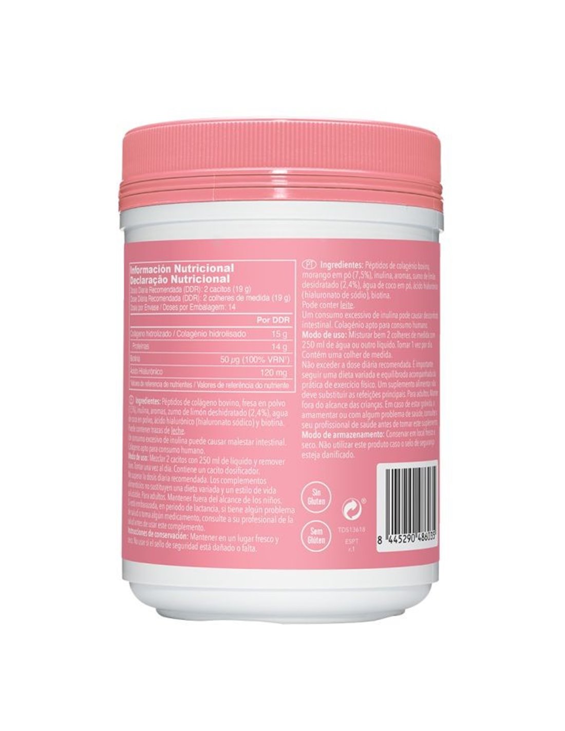 Ingredientes:Péptidos de colágeno bovino, fresa en polvo (7,5%), inulina, aromas, zumo de limón deshidratado (2,4%), agua de coco en polvo, ácido hialurónico (hialuronato sódico) y Biotina.Modo de empleo:Mezclar 2 cacitos con 250 ml de líquido y remover bien. Puede mezclarse con líquidos calientes o fríos como el té, smooties o agua.Presentación:Envase de 271 gramos sabor fresa-limón.Recomendaciones y advertencias:Puede contener trazas de leche. Apto para todo tipo de dietas: sin gluten, ni azúcares añadidos.