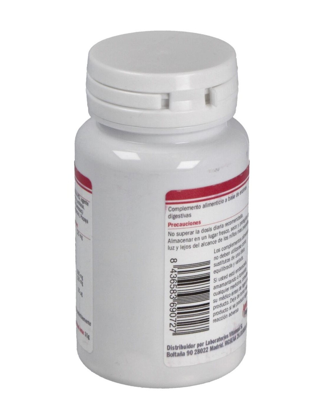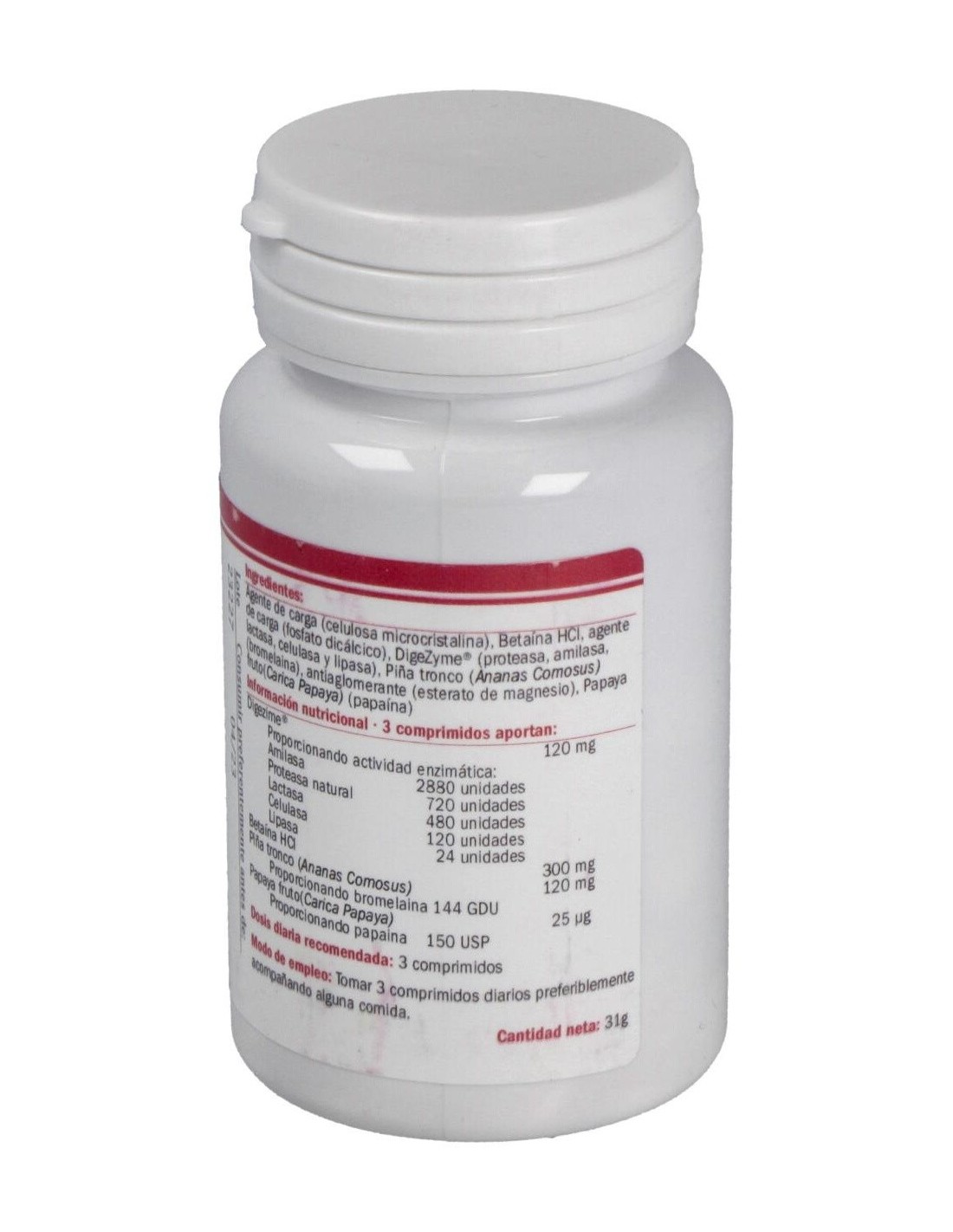 Ingredientes:Agente de carga (celulosa microcristalina), Betaína HCl, agente de carga (fosfato dicálcico), DigeZyme® (proteasa, amilasa, lactasa, celulasa y lipasa), Piña tronco (Ananas Comosus) (bromelaina), antiaglomerante (esterato de magnesio), Papaya fruto (Carica Papaya) (papaína).Modo de empleo:Tomar 3 comprimidos al día.Presentación:Envase de 100 comprimidos.Recomendaciones y advertencias:No contiene gluten.