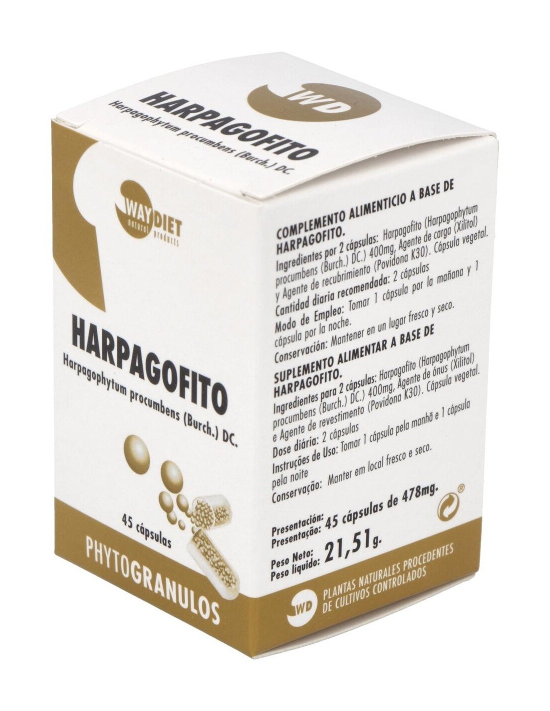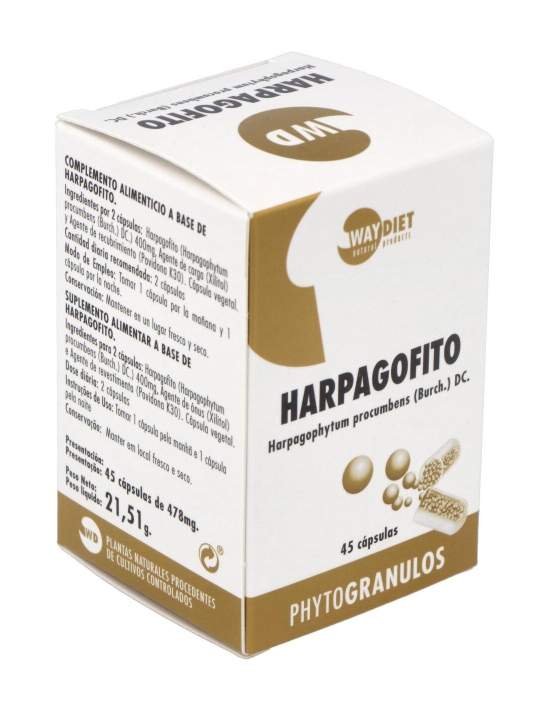 Harpagofito Phytogranulos 45Caps. de Waydiet Natural Products es un suplemento diseñado para personas que buscan complementar su bienestar diario con ingredientes de origen natural. Su formulación está pensada para quienes valoran productos elaborados con extractos vegetales específicos.