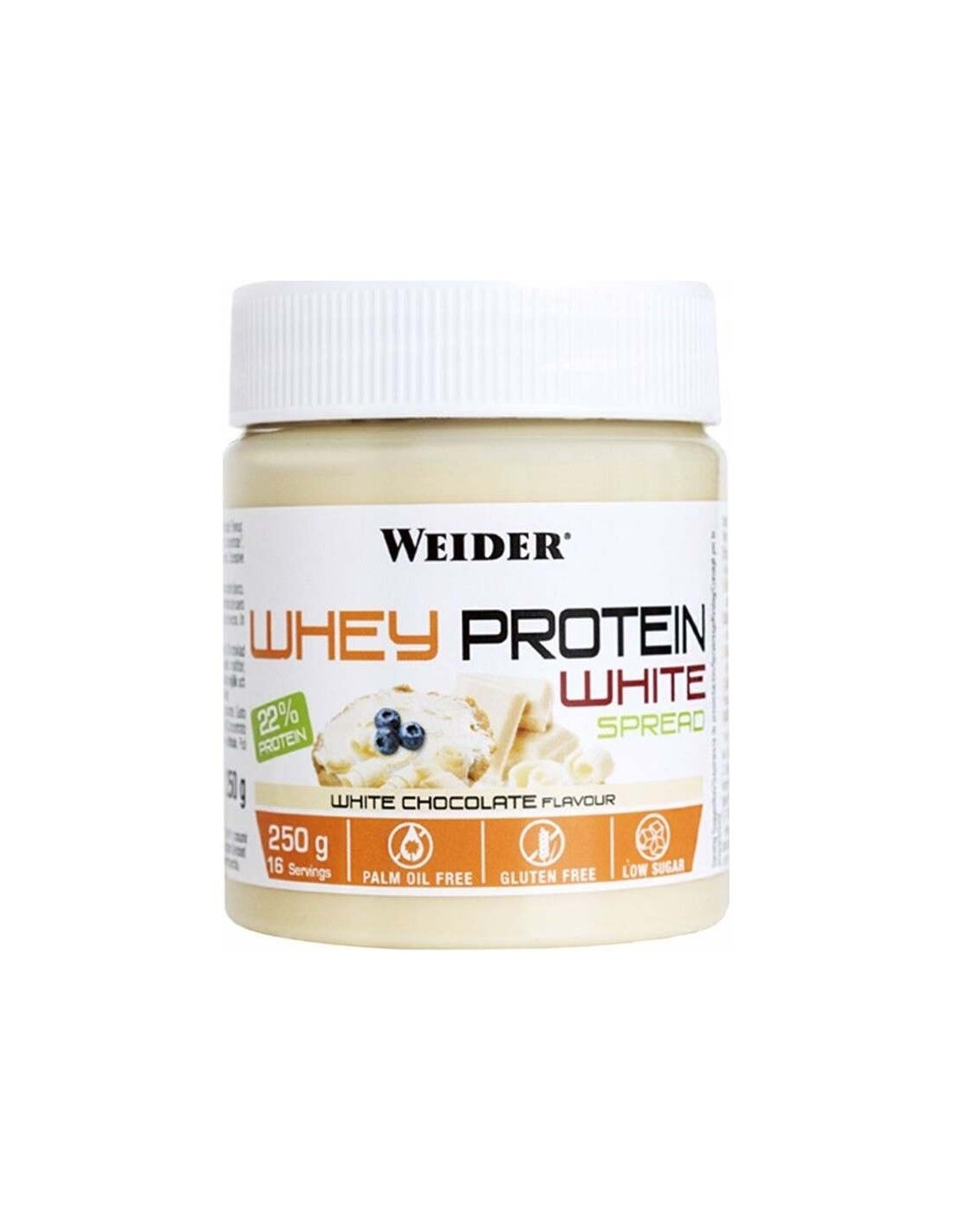 WEIDERWhey Protein White es una crema de proteína de suero de leche para untar con un delicioso sabor a chocolate blanco. La proteína de suero es rica en aminoácidos esenciales y BCAA, los aminoácidos más importantes para el músculo esquelético. Baja en azúcares y sin gluten.
