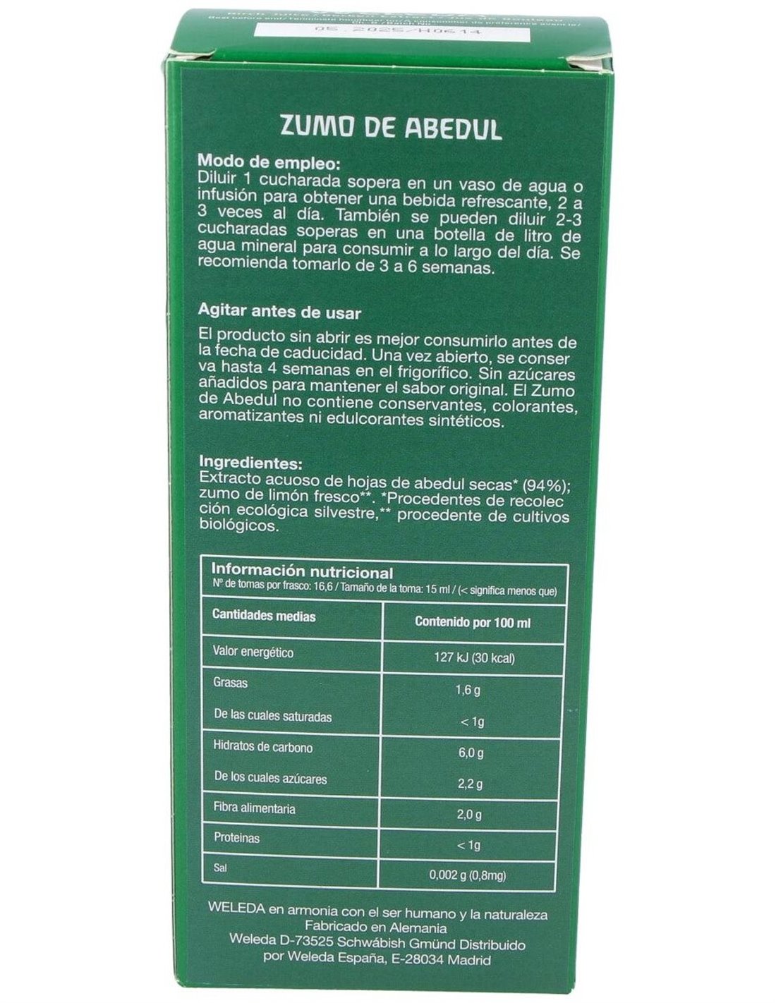 Diluir dos veces al día una cucharada sopera de Zumo de Abedul de Weleda en agua, infusiones o zumo. Agitar antes de usar. Tomar con las comidas. Se recomienda hacer el detox durante 5 o 6 semanas en las estaciones de transición (primavera y otoño).