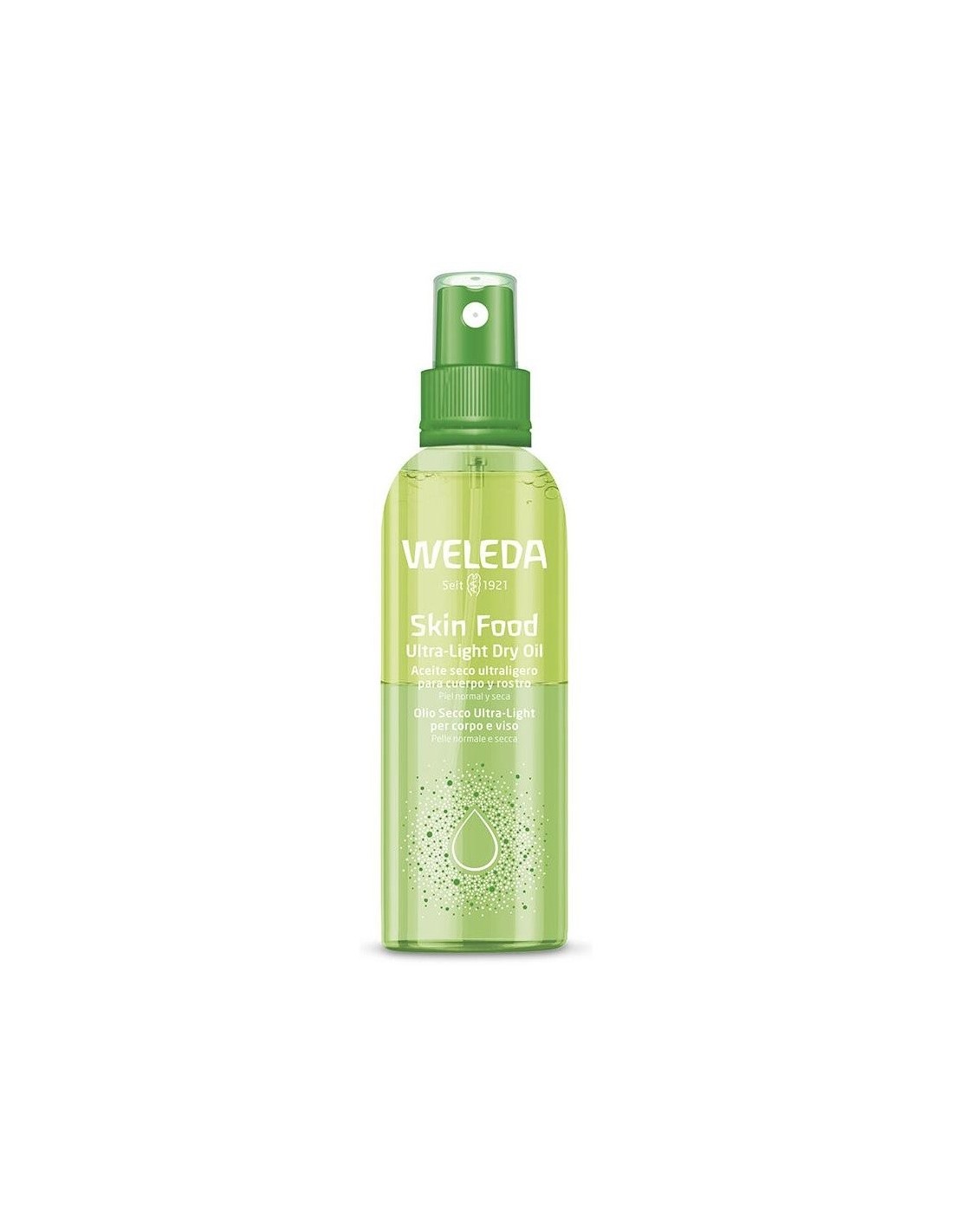 WELEDAAceite iluminador nutritivo de textura ultraligera en formato spray. Con todos los beneficios de la fórmula Skin Food. Rápida absorción y sensación no