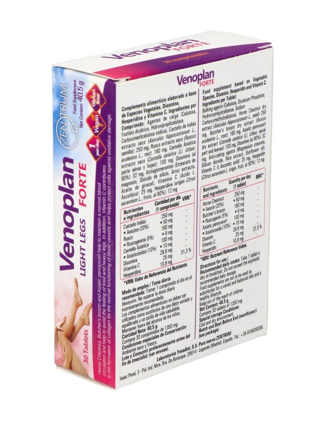 Complemento alimenticio elaborado a base de extractos naturales. La fórmula contiene castaño de Indias extracto seco, rusco extracto seco, centella asiática extracto seco, diosmina , vitamina C y hesperidina. Ayudan a mantener una circulación sanguínea normal y contribuyen a evitar la sensación de piernas cansadas y pesadas. Además la Vitamina C contribuye a la formación de colágeno para el normal funcionamiento de los vasos sanguíneos y ayuda a la protección de las células frente al daño oxidativo.