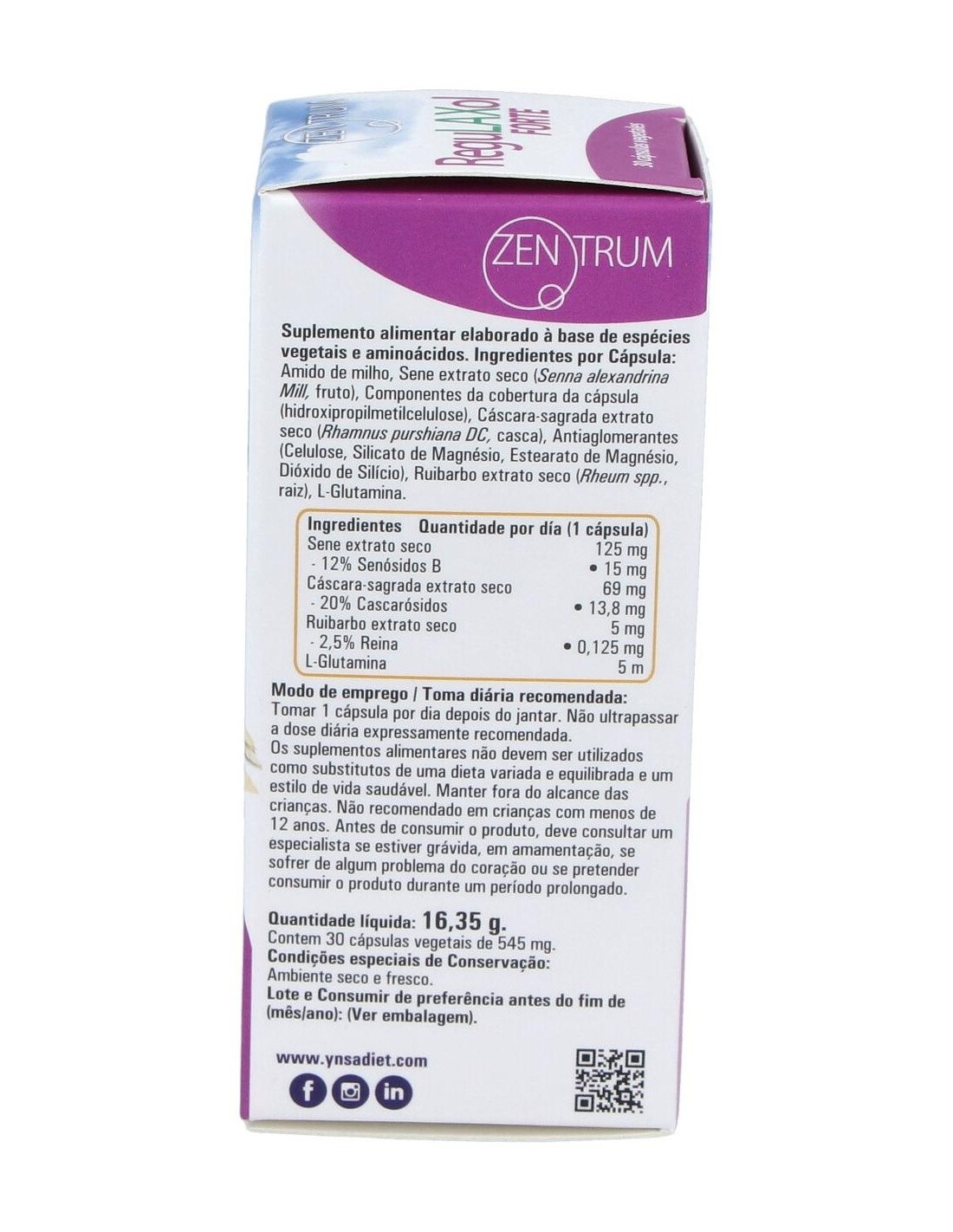 Almidón de maíz, Sen extracto seco (Senna alexandrina Mill, fruto), Componentes de la cubierta de la cápsula (hidroxipropilmetilcelulosa), Cáscara sagrada extracto seco (Rhamnus purshiana DC, corteza), Antiaglomerantes (Celulosa, Silicato de Magnesio, Estearato de Magnesio, Dióxido de silicio), Ruibarbo extracto seco (Rheum spp., raíz), L-Glutamina.