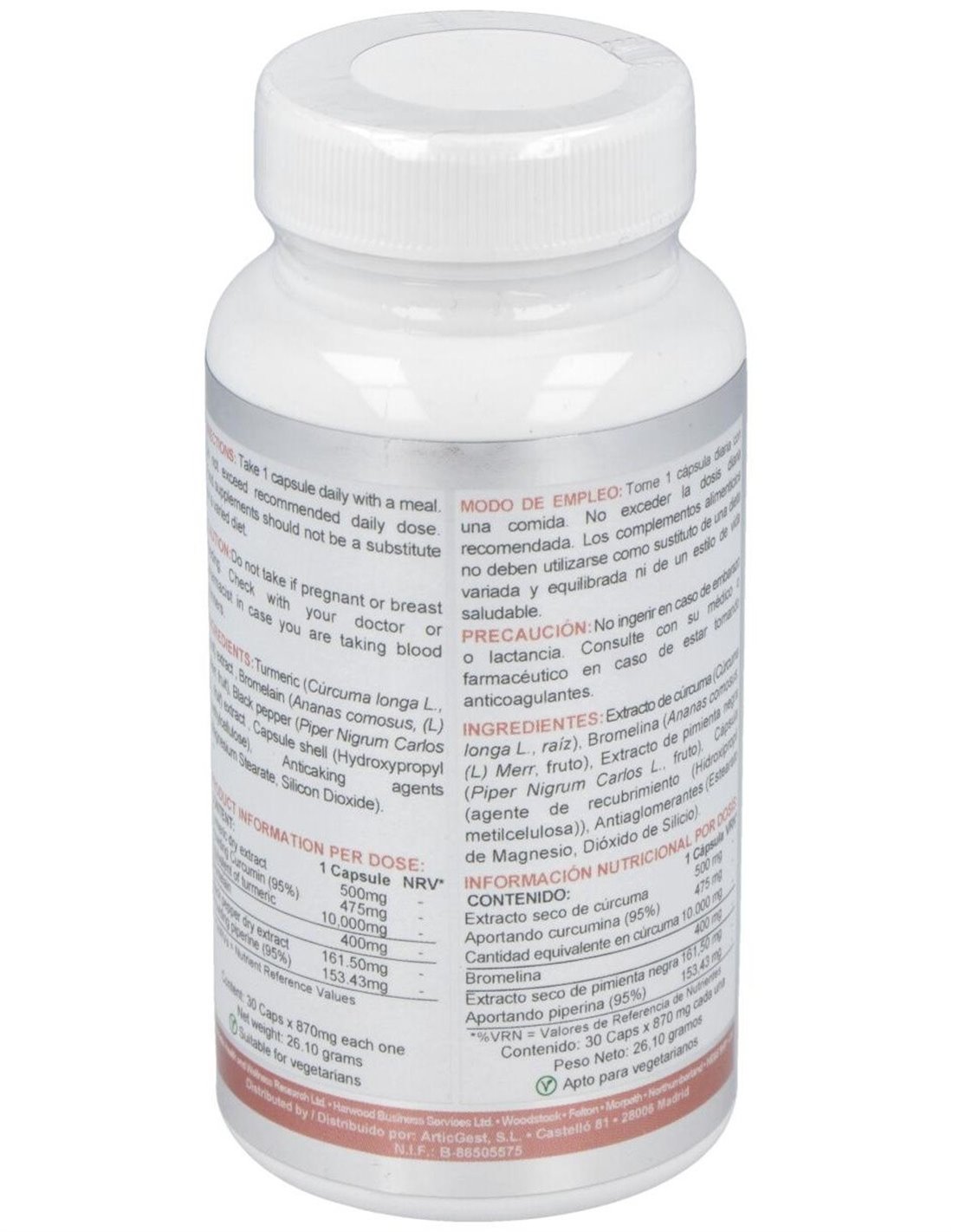Producto que contiene 500 mg de extracto de cúrcuma estandarizado al 95% de curcumina, lo que garantiza 475 mg de esta sustancia por comprimido.