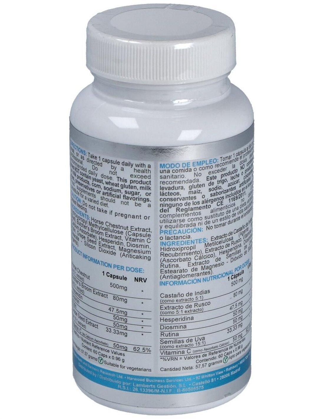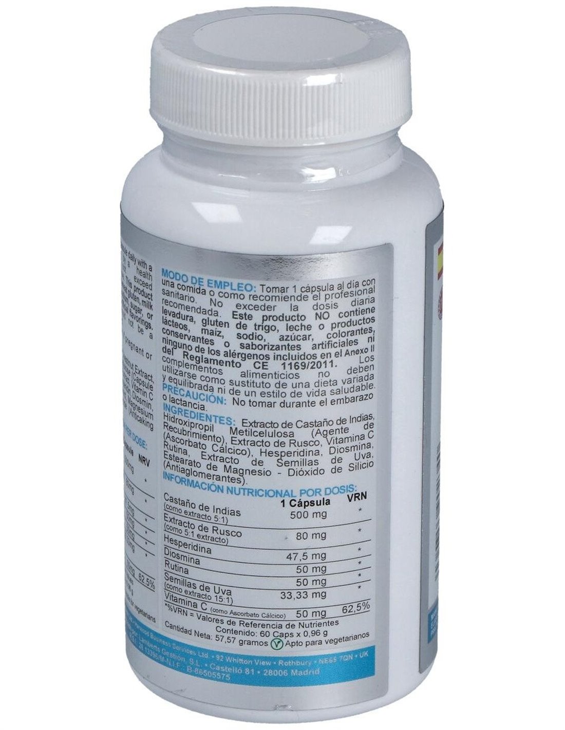 Complemento alimenticio en formato de cápsulas que está especialmente ideado para ayudar a la normal formación del colágeno para una adecuada función de los vasos sanguíneos, gracias a su compuesto que está elaborado a base de castaño de Indias (Aesculus hippocastanum), semilla de uva (Vitis vinifera), rusco (Ruscus aculeatus), rutina, diosmina y hesperidina.