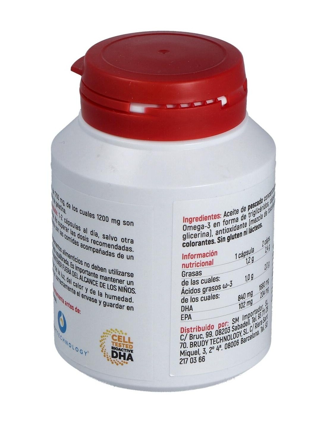 1.200 mg de aceite de pescado concentrado en ácidos grasos Omega-3 en forma de triglicéridos (840 mg DHA y 102 mg EPA), cápsula (gelatina, agua, glicerina), antioxidante (mezcla de tocoferoles).