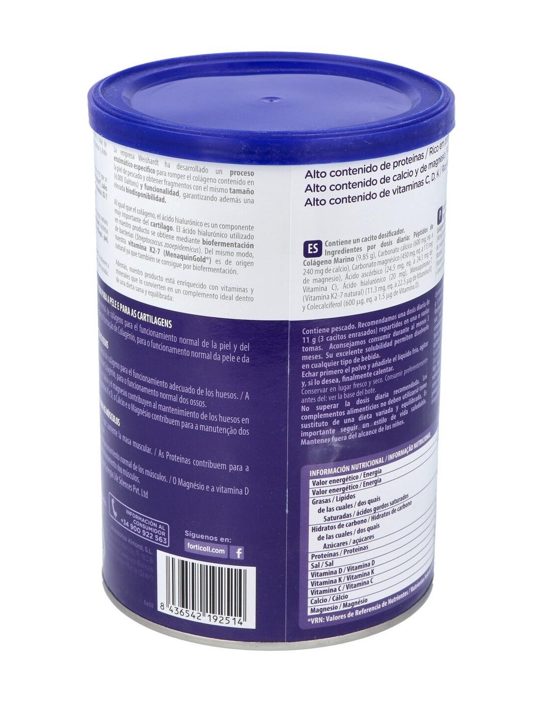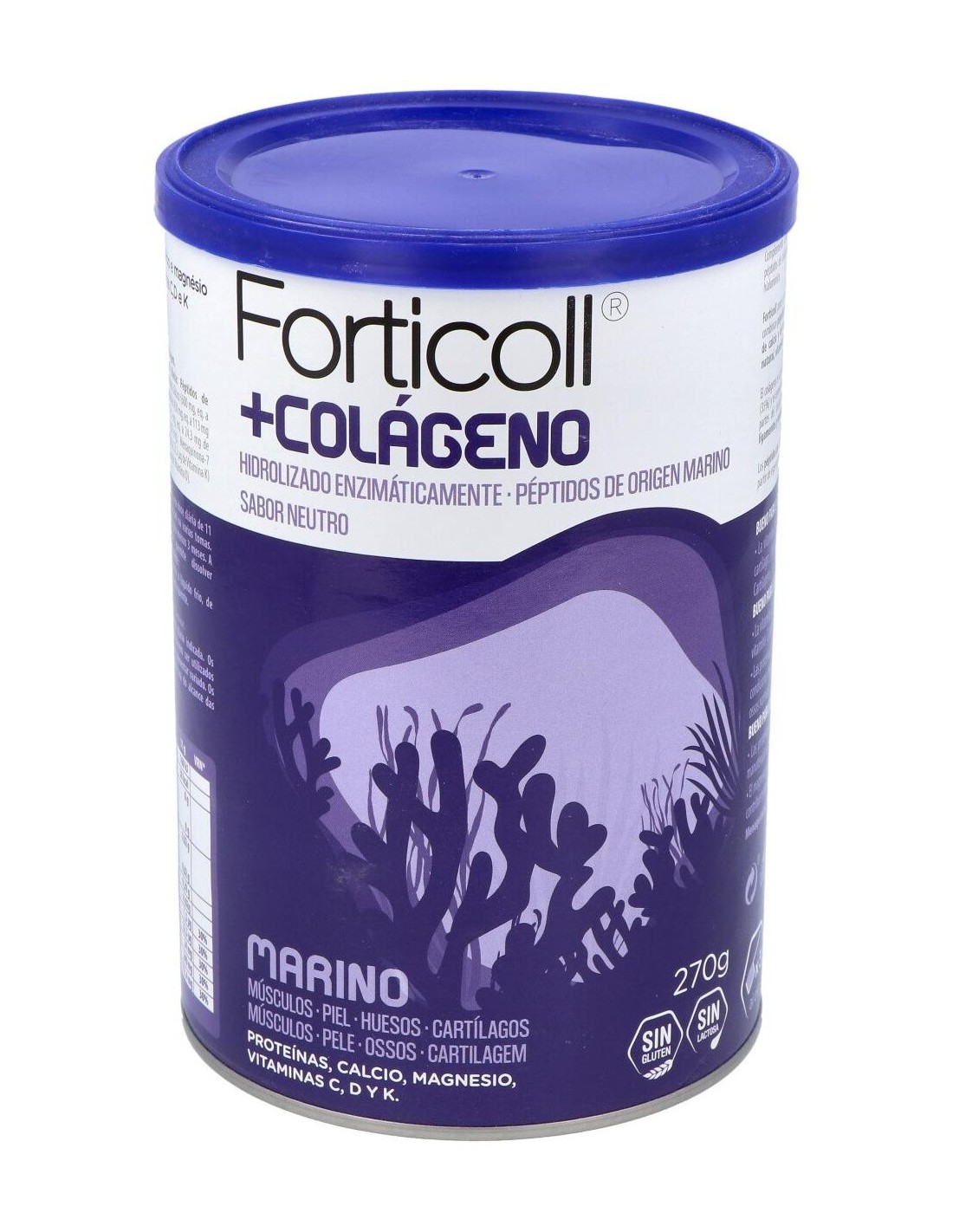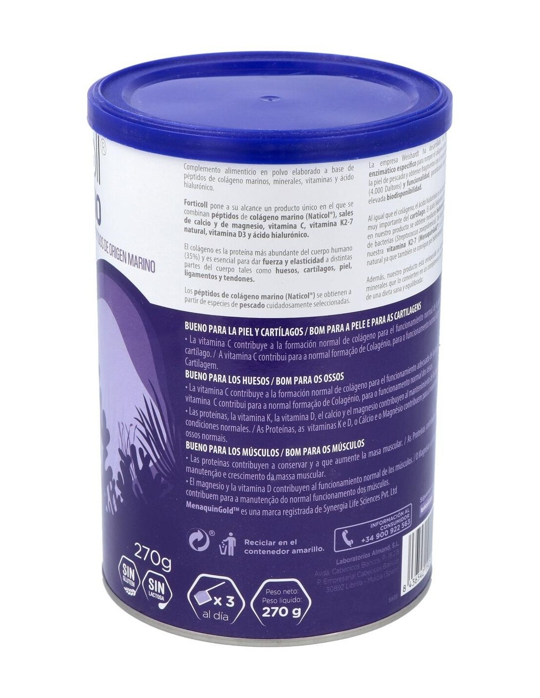 Forticoll Colageno Marino 270g complemento alimenticio en polvo a base de Colágeno Hidrolizado de origen marino, Minerales, Vitaminas y Ácido Hialurónico que proporciona fuerza y elasticidad a huesos, ligamentos, cartílagos, piel y tendones.