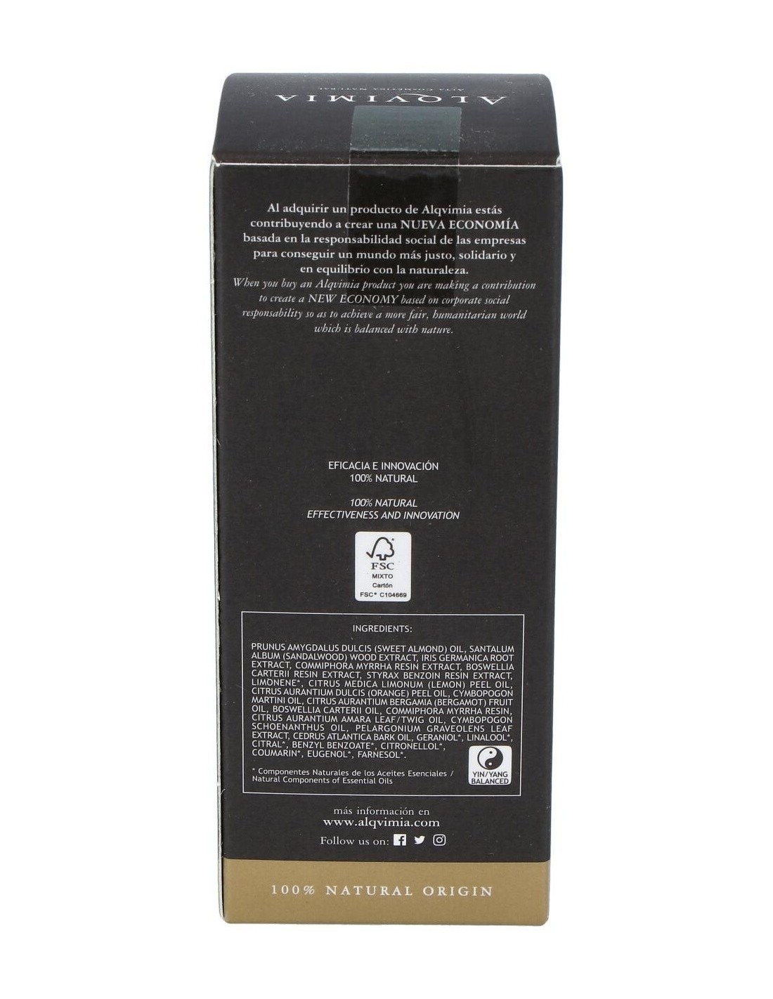 Prunus amygdalus dulcis (sweet almond) oil, santalum album (sandalwood) wood extract, iris germanica root extract, commiphora myrrha resin extract, boswellia carterii resin extract, styrax benzoin resin extract, limonene*, citrus medica limonum (lemon) peel oil, citrus aurantium dulcis (orange) peel oil, cymbopogon martini oil, citrus aurantium bergamia (bergamot) fruit oil, boswellia carterii oil, commiphora myrrha resincitrus aurantium amara leaf/twig oil, cymbopogon schoenanthus oil, pelargonium graveolens leaf extract, cedrus atlántica bark oil, geraniol*, linalool*, coumarin*, eugenol*, farnesol*