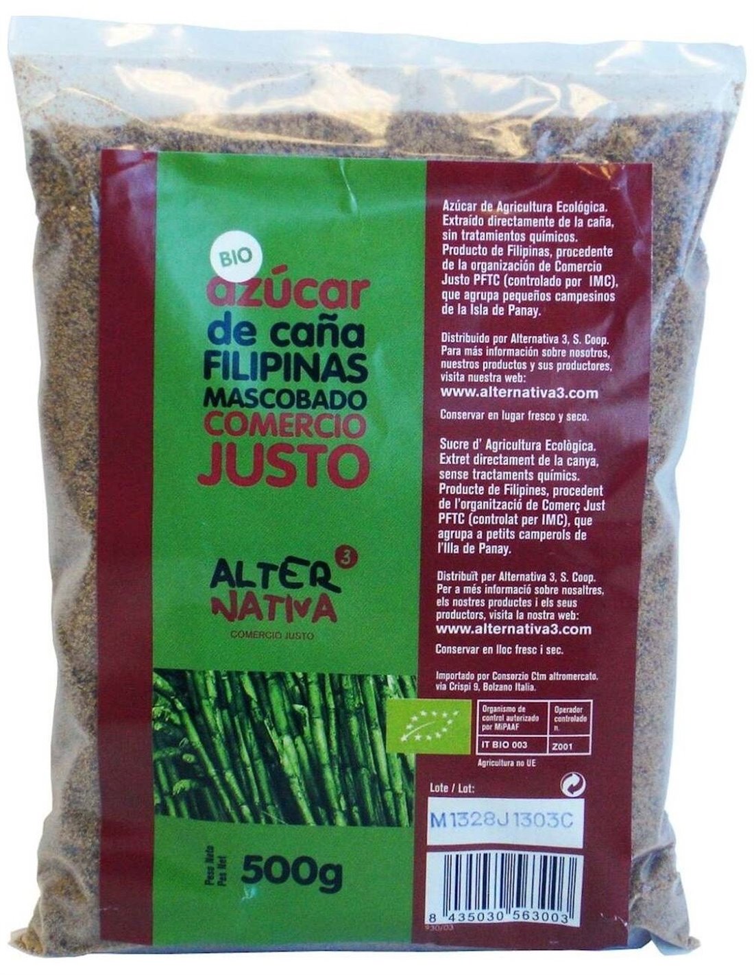 Azúcar de caña mascobado en empaque de plástico de 500gr. El azúcar de tipo mascobado es el nombre que se le da en Filipinas al azúcar de caña integral. Elaborado de forma artesanal, es un azúcar sin refinar que se extrae directo de la caña por evaporación. Su textura no es homogénea y, aunque no contiene cristales, sí presenta grumos de melaza. Al no ser refinado, conserva todas las sustancias nutritivas de la planta, así como minerales como el calcio, el hierro, el potasio, el fósforo y el magnesio. Este producto de Alternativa3 cuenta con el certificado de alimentación ecológica y de comercio justo. En su elaboración no se aplica ningún proceso de refinamiento ni ningún tipo de proceso químico. No contiene aceite de palma ni gluten y es adecuado para consumidores tanto veganos como vegetarianos.