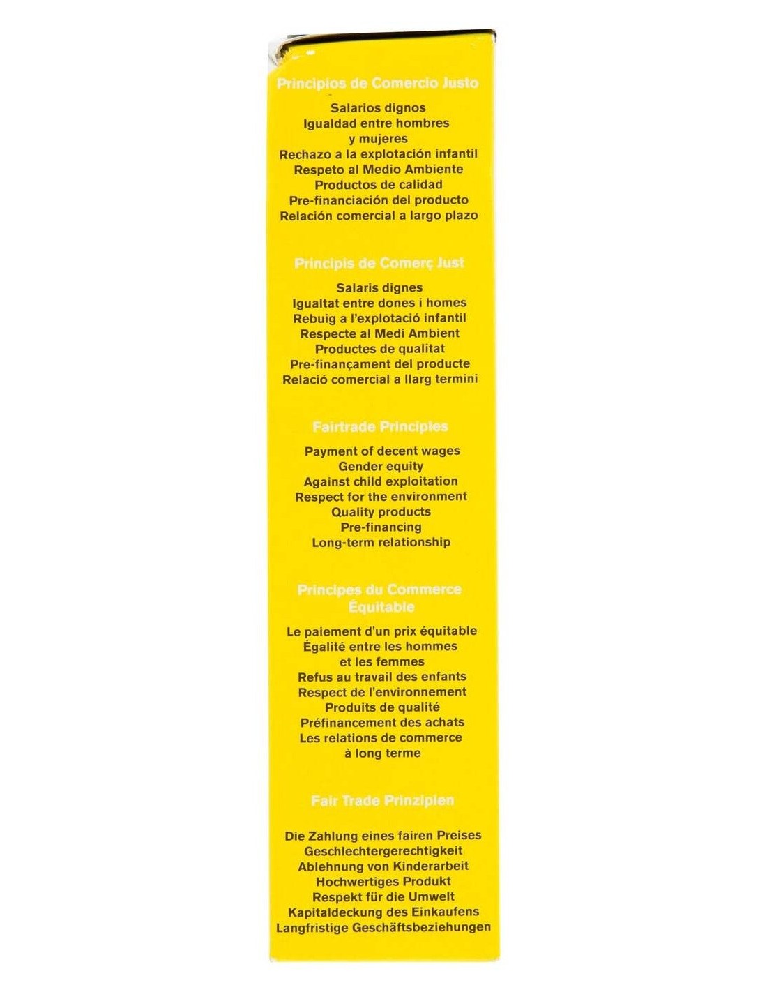 Alternativa3 cumple con las premisas de Comercio Justo, forma alternativa de comercio internacional, en la elaboración de este café. Estos principios incluyen la justicia social con salarios dignos iguales para hombres y mujeres así como el rechazo de la explotación infantil. También son respetuosos con el medio ambiente y con los derechos humanos.