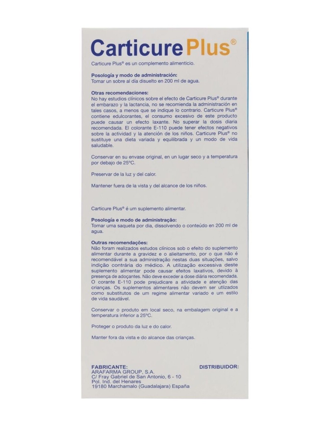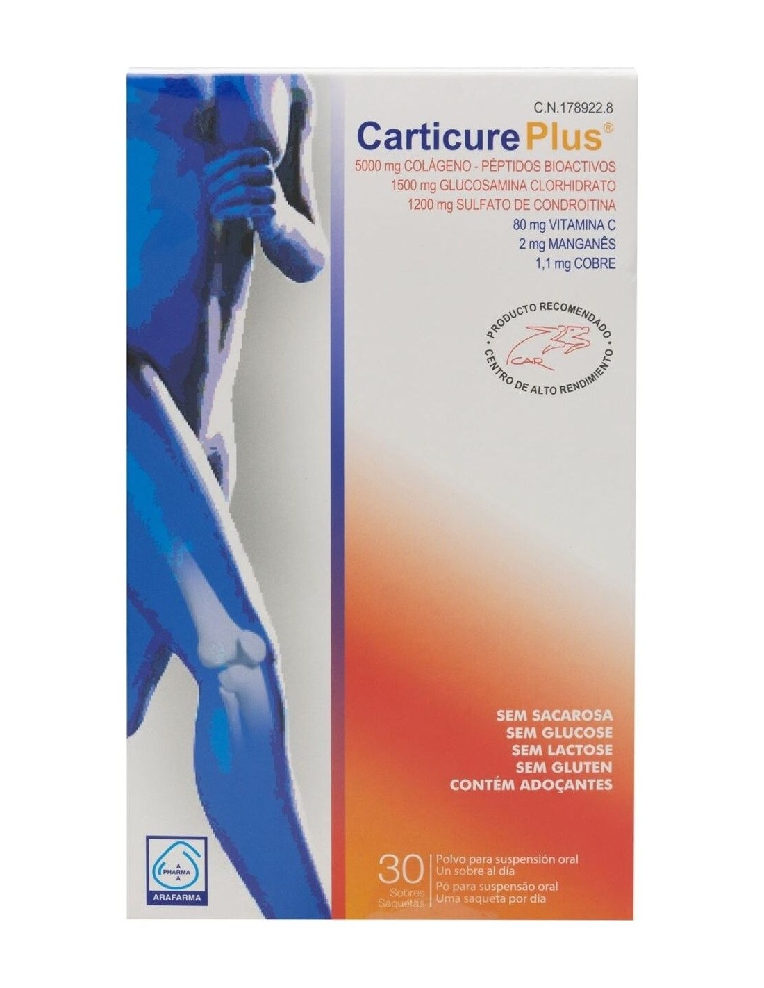 ARAFARMACombina glucosamina, condroitín sulfato y colágeno, componentes naturales del cartílago. Además, contiene vitamina C y manganeso, en las cantidades diarias recomendadas para ayudar a la normal formación del colágeno y a la protección articular frente al estrés oxidativo. Agradable sabor a naranja.\ \ Carticure Plus sobres es un complemento alimenticio en polvo que ofrece una combinación de glucosamina, condroitín sulfato y colágeno, los cuales trabajan en sinergia para brindar un apoyo al normal desempeño de las articulaciones. Ha sido especialmente diseñado con ingredientes que pueden ser de utilidad frente al desgaste en las articulaciones, como los deportistas de alto rendimiento, los adultos mayores que mantienen una actividad física regular o las personas con exceso de peso y hábitos sedentarios poco saludables. Carticure Plus contiene también una cantidad de vitamina C, manganeso y cobre, nutrientes esenciales que ayudan a la normal formación y síntesis del colágeno, y pueden aportar un apoyo al sistema articular frente al estrés oxidativo.