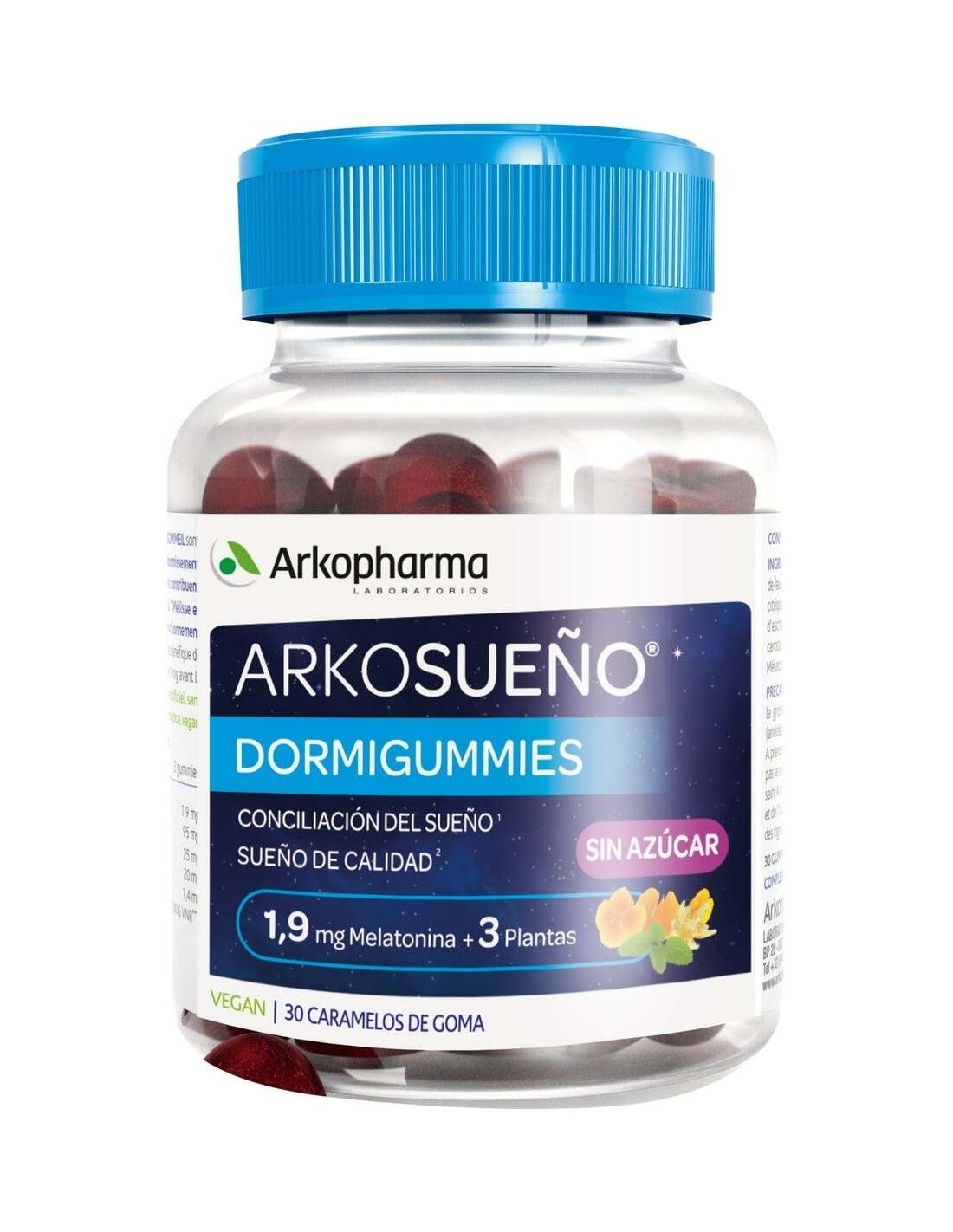 ARKOPHARMALos caramelos de goma sin azúcar Arkosueño® Dormigummies están especialmente pensados para ayudar a reducir el tiempo de conciliación del sueño gracias su fórmula con 1,9 mg de Melatonina + 3 plantas: Melisa, Amapola de California y Tila. La Melatonina contribuye a la conciliación del sueño tanto al comienzo como en despertares nocturnos. La Melisa y la Tila ayudan a la relajación y la Amapola de California a la calidad del sueño. La vitamina B6 contribuye al funcionamiento normal del sistema nervioso. A partir de 15 años.
