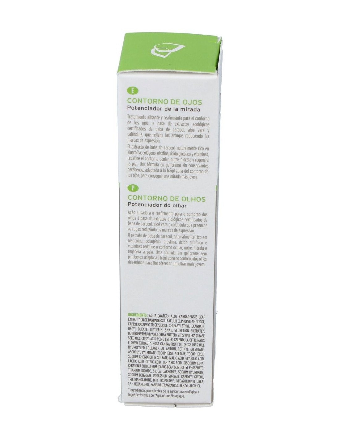 Gel fluido hidratante diseñado para el cuidado de la piel sensible del contorno de los ojos. Formulado a base de extracto de baba de caracol orgánica y extracto de aloe vera. Ayuda a rellenar las líneas de expresión y a suavizar los rasgos estresados y cansados para conseguir un aspecto rejuvenecido. El extracto de baba de caracol, es rico en alantoína, colágeno, elastina, ácido glicólico y vitaminas, favorece la redefinición del contorno de los ojos y a regenerar la piel. Sin parabenos con ingredientes procedentes de la agricultura biológica. Indicado para todo tipo de pieles.