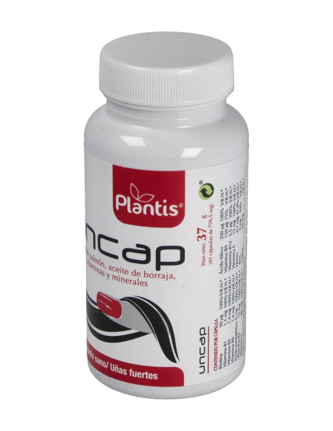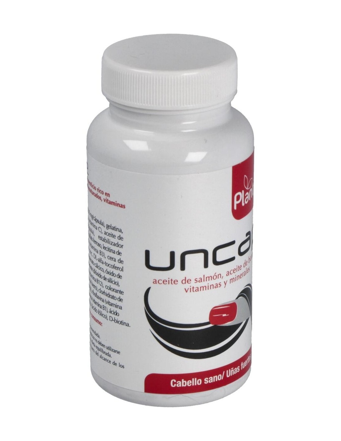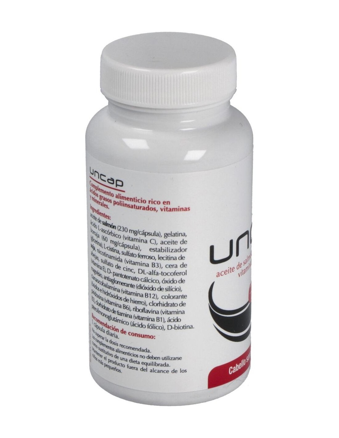 Aceite de salmón (230 mg/cápsula), Gelatina comestible, Estabilizador (glicerina), Aceite de borraja (60 mg/cápsula), Vitamina C, L-cistina, Sulfato magnésico, Aceite de soja, Sulfato ferroso, Lecitina de soja, Nicotinamida, Cera de abejas, Vitamina E, Pantotenato cálcico, Óxido de zinc, Colorantes (ponceau 4R, dióxido de titanio), Vitamina B6, Vitamina B2, Vitamina B1, Ácido fólico, Vitamina B12.