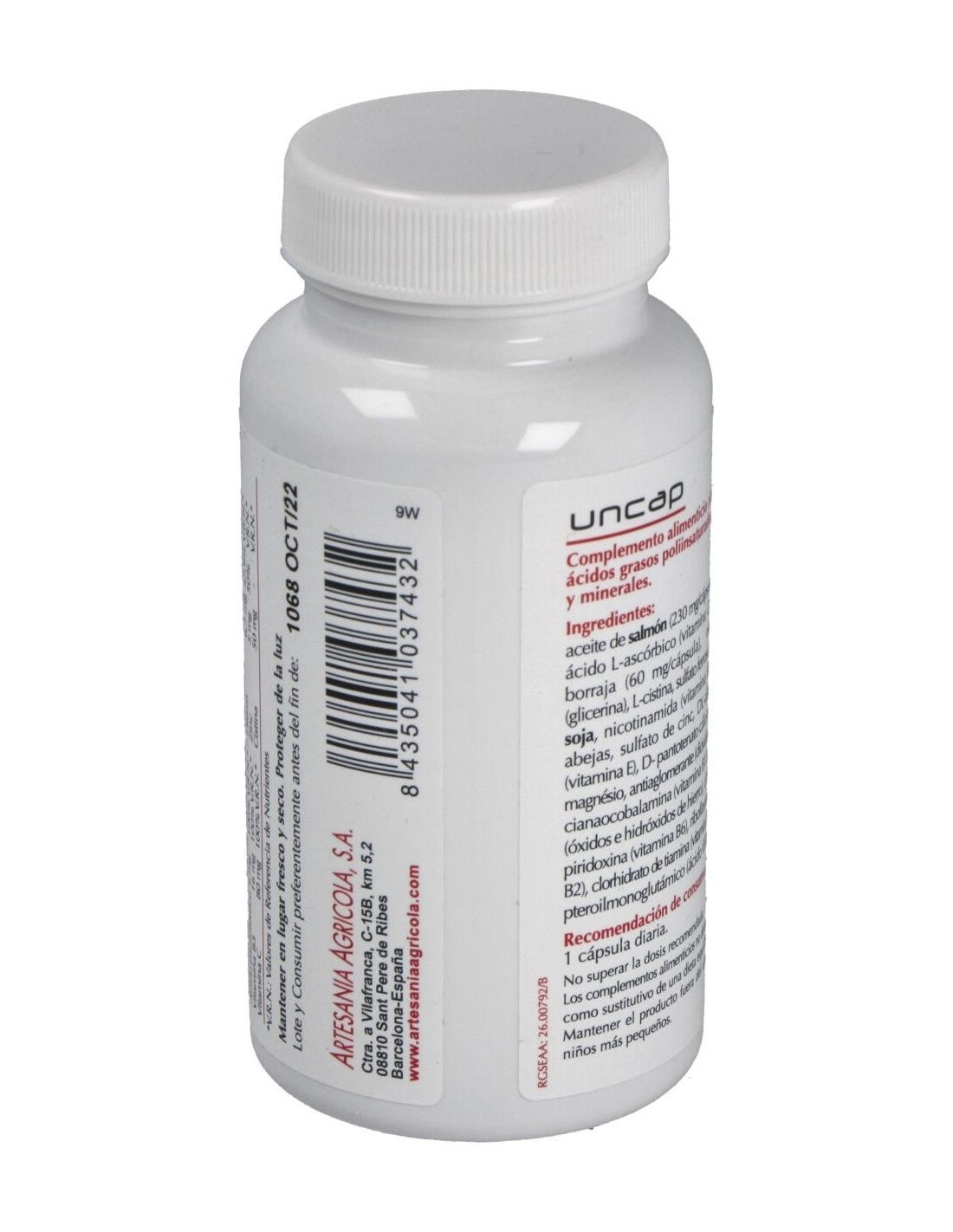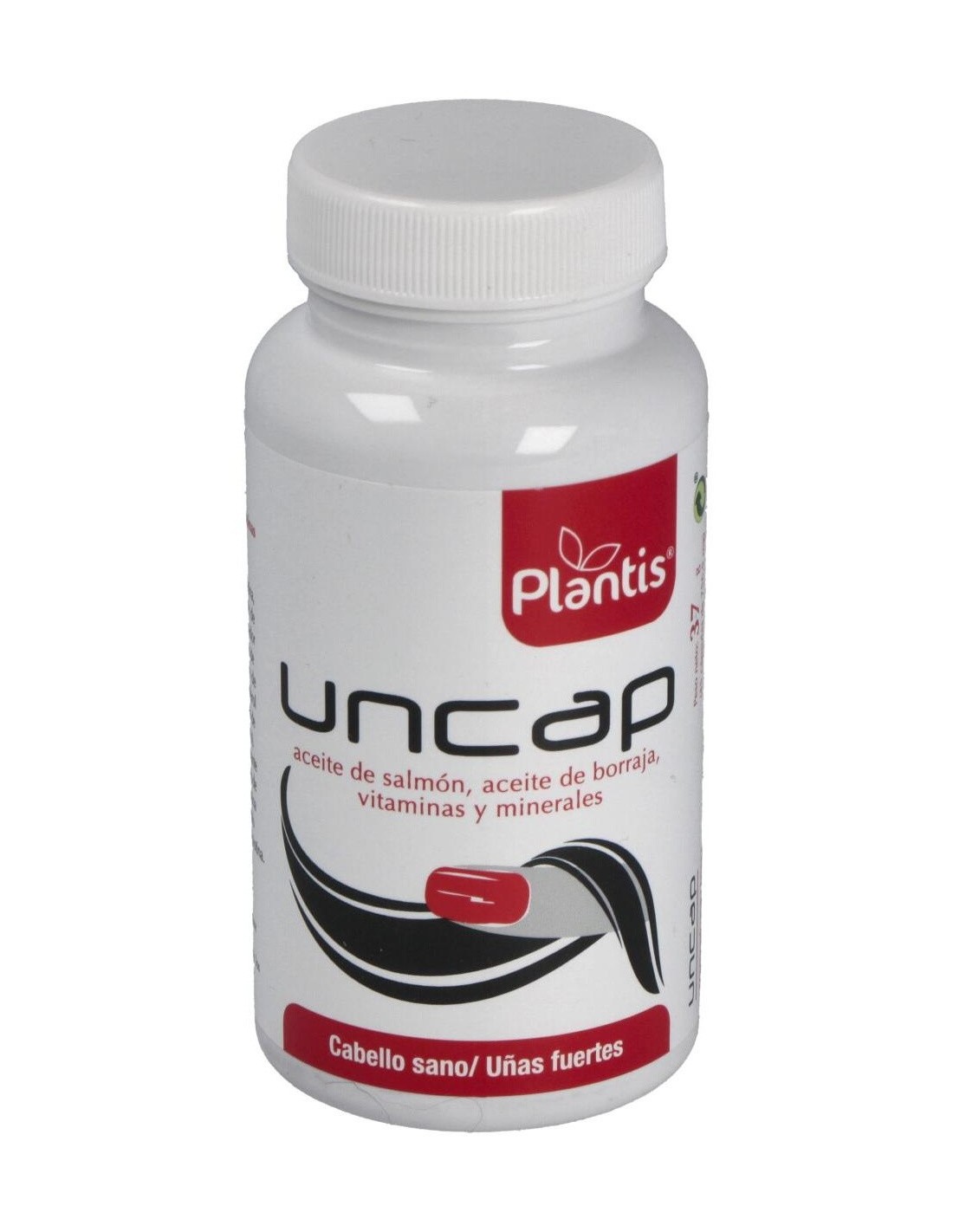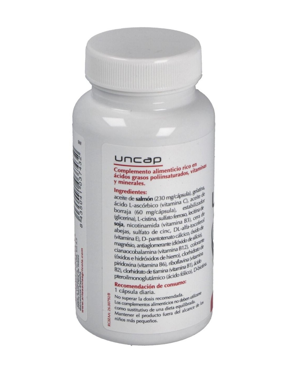 Aceite de salmón (230 mg/cápsula), Gelatina comestible, Estabilizador (glicerina), Aceite de borraja (60 mg/cápsula), Vitamina C, L-cistina, Sulfato magnésico, Aceite de soja, Sulfato ferroso, Lecitina de soja, Nicotinamida, Cera de abejas, Vitamina E, Pantotenato cálcico, Óxido de zinc, Colorantes (ponceau 4R, dióxido de titanio), Vitamina B6, Vitamina B2, Vitamina B1, Ácido fólico, Vitamina B12.