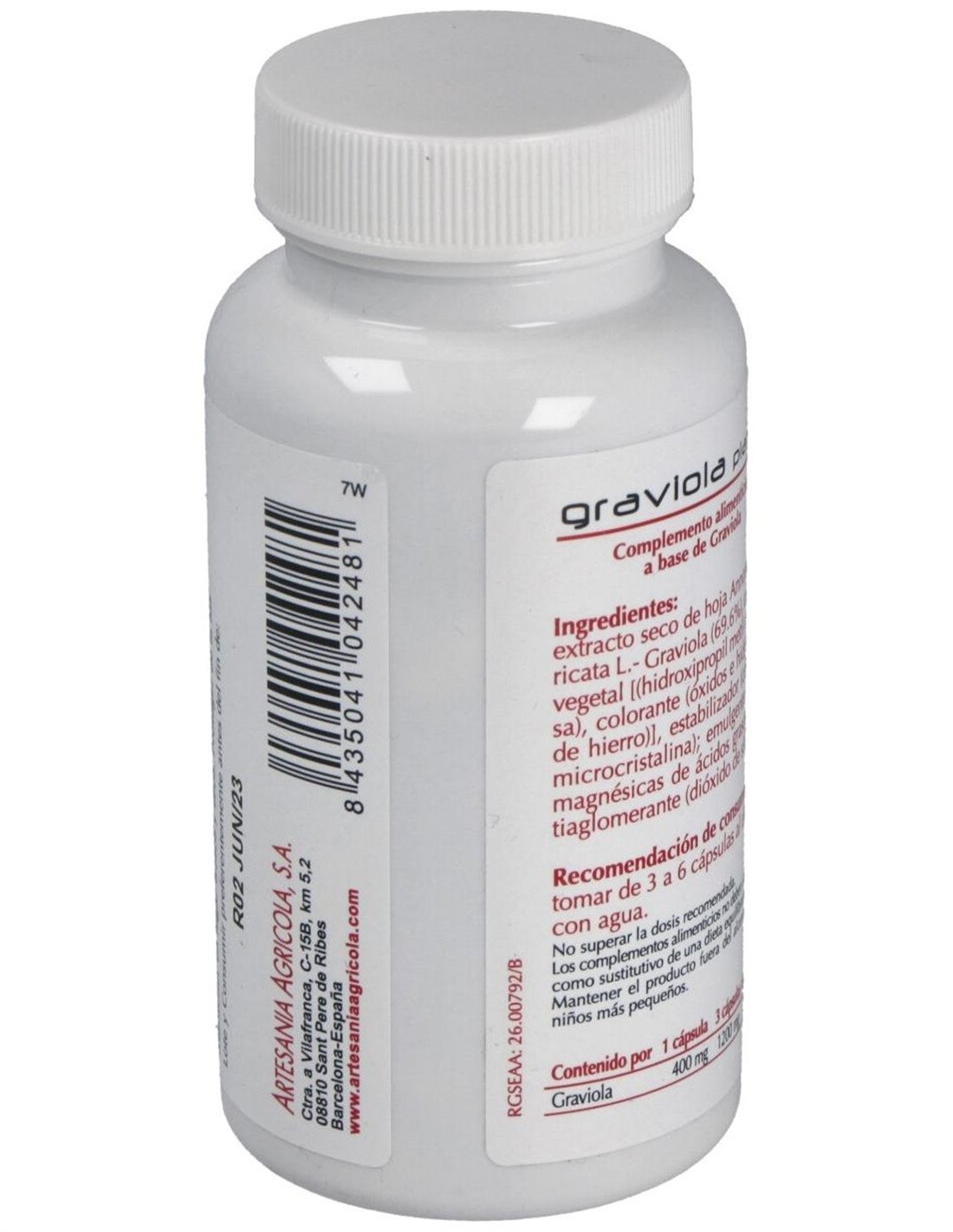 Extracto Seco De Hoja Annona Muricata L.-Graviola (69,6%), Cápsula Vegetal, Colorante, Estabilizador (Celulosa Microcristalina); Emulgente (Sales Magnésicas De Ácidos Grasos), Antiaglomerante (Dióxido De Silicio).