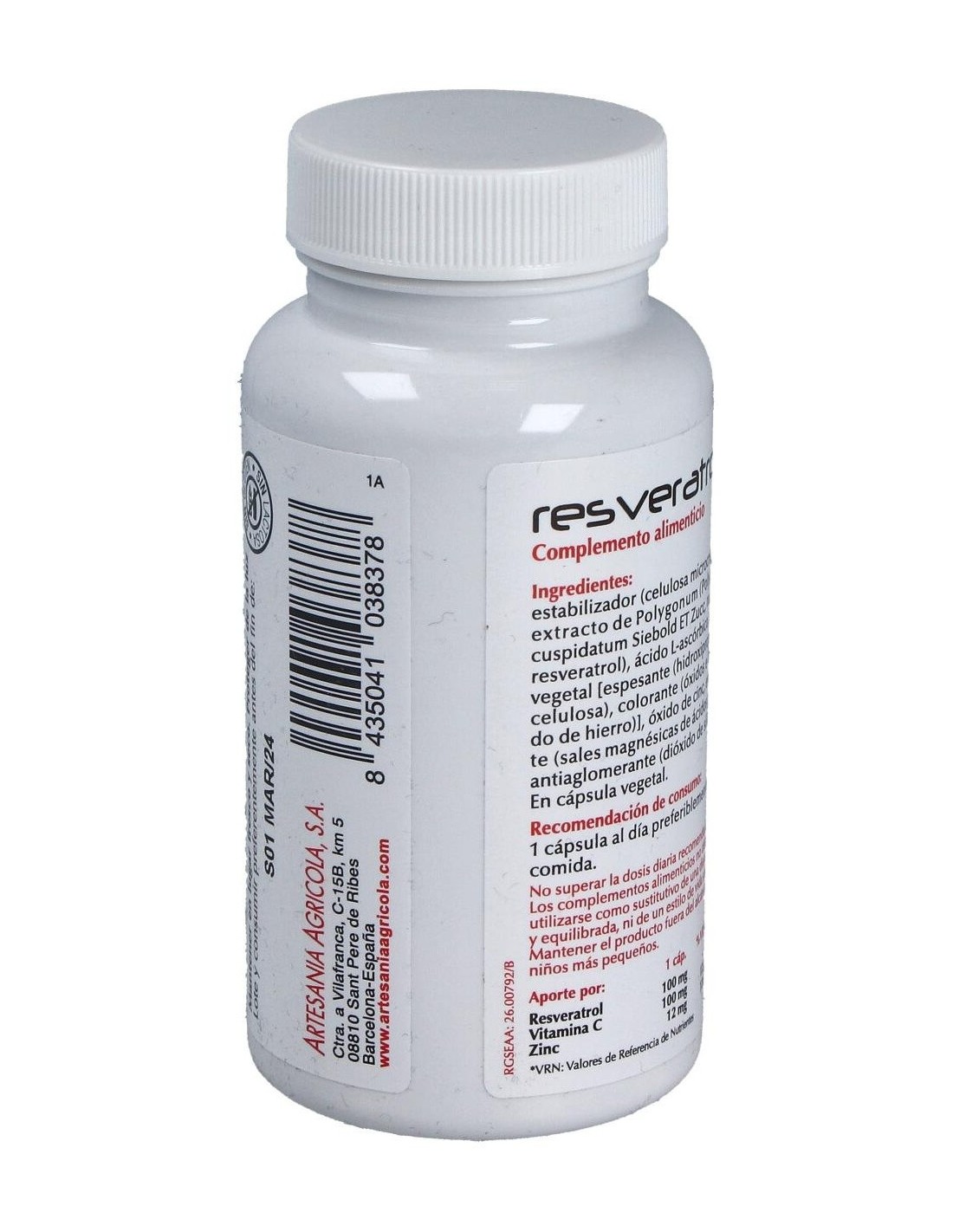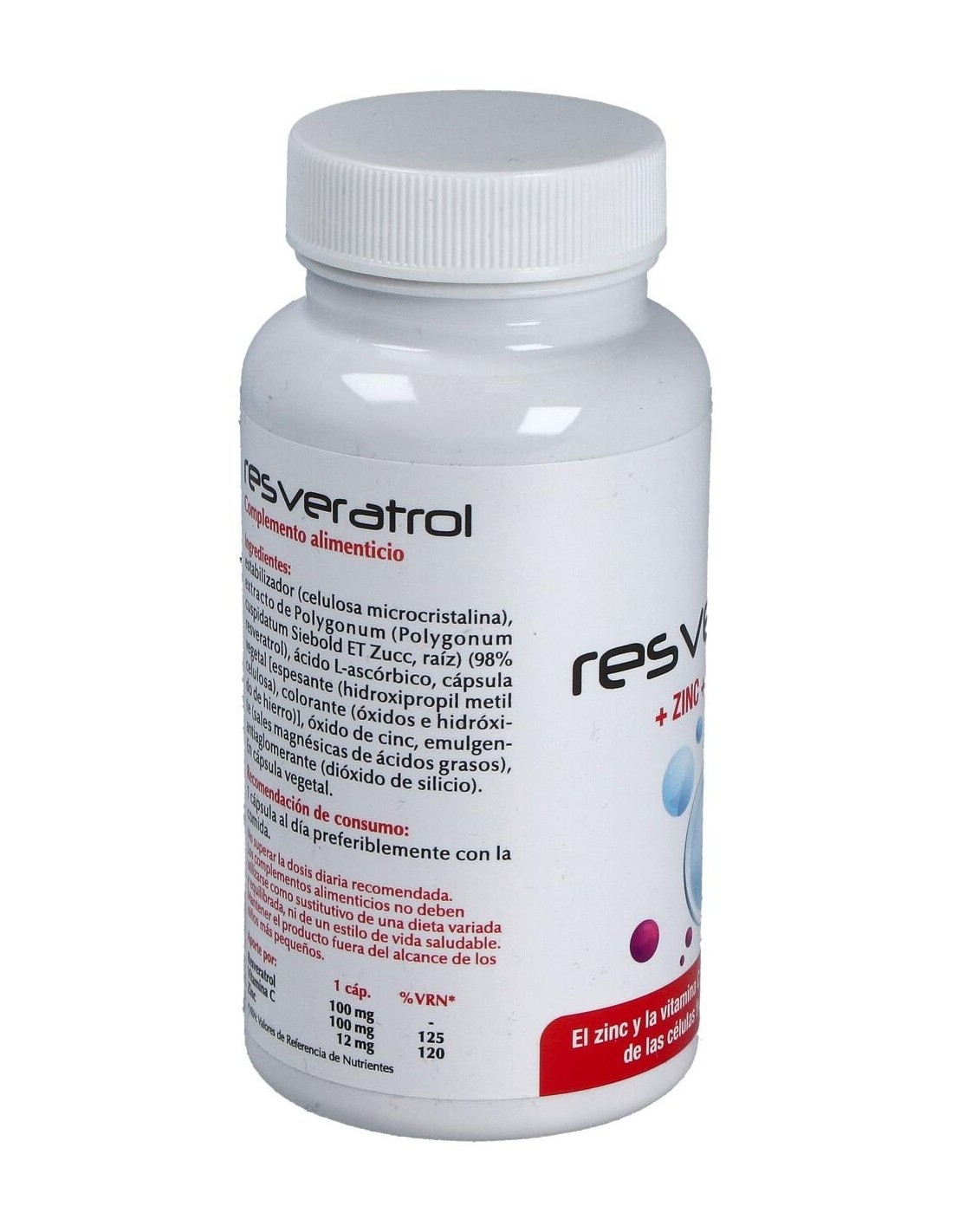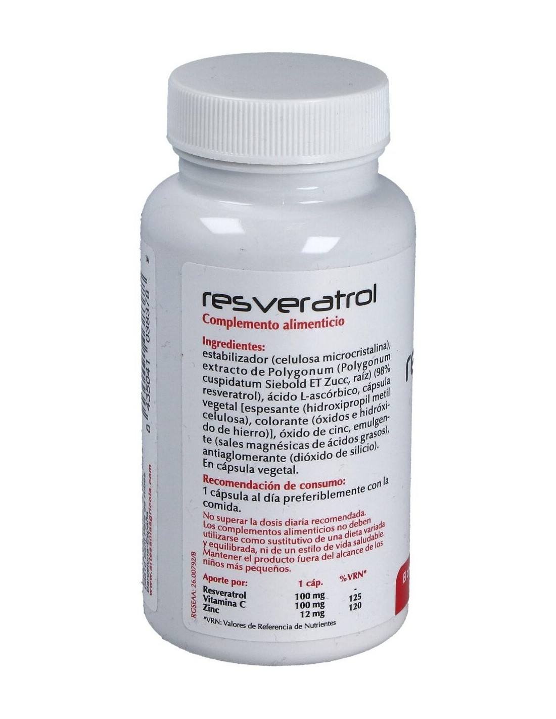 Estabilizador (celulosa microcristalina), extracto de Polygonum (Polygonum cuspidatum Siebold ET Zucc, raíz) (98% resveratrol), ácido L-ascórbico, cápsula vegetal [espesante (hidroxipropil metil celulosa), colorante (óxidos e hidróxidos de hierro)], óxido de cinc, emulgente (sales magnésicas de ácidos grasos), antiaglomerante (dióxido de silício. )En cápsula vegetal.