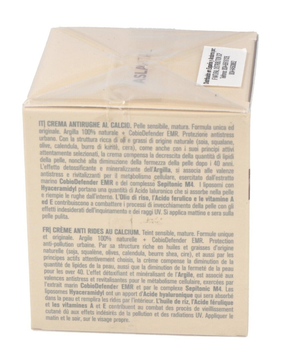 Aceites y grasas de origen natural (soja, escualeno, olivas, caléndula, manteca de karité, cera), arcilla, extracto marino CobioDefender EMR, complejo Sepitonic M4 (coctail de sales minerales), liposomas con Hyaceramidyl, aceite de arroz, ácido ferúlico, vitaminas A y E, otros.