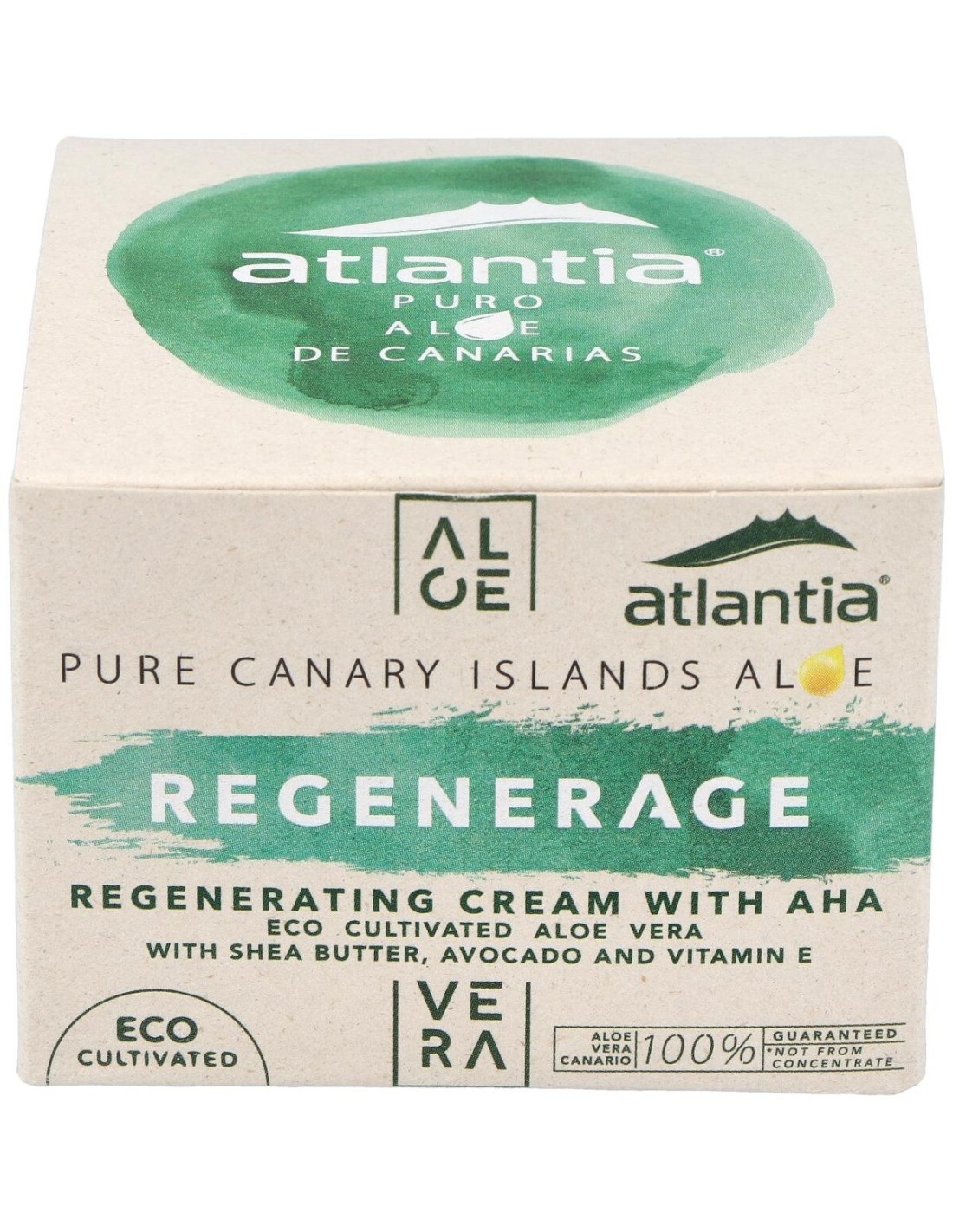 Atlantia Crema Regeneradora con AHA 50ml es una crema de efecto antiedad enriquecida con aloe vera que contribuye a proteger la piel de las agresiones que provocan y aceleran el envejecimiento. Además, contiene alfa hidroxiácidos de marcado efecto hidratante que ayudan a reafirmar la piel y está enriquecida con aceite de aguacate y manteca de karité.; ingredientes humectantes de efecto hidratante. Contiene 50ml.