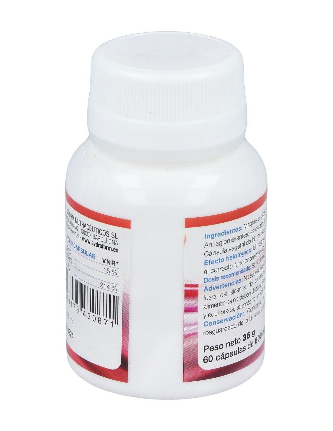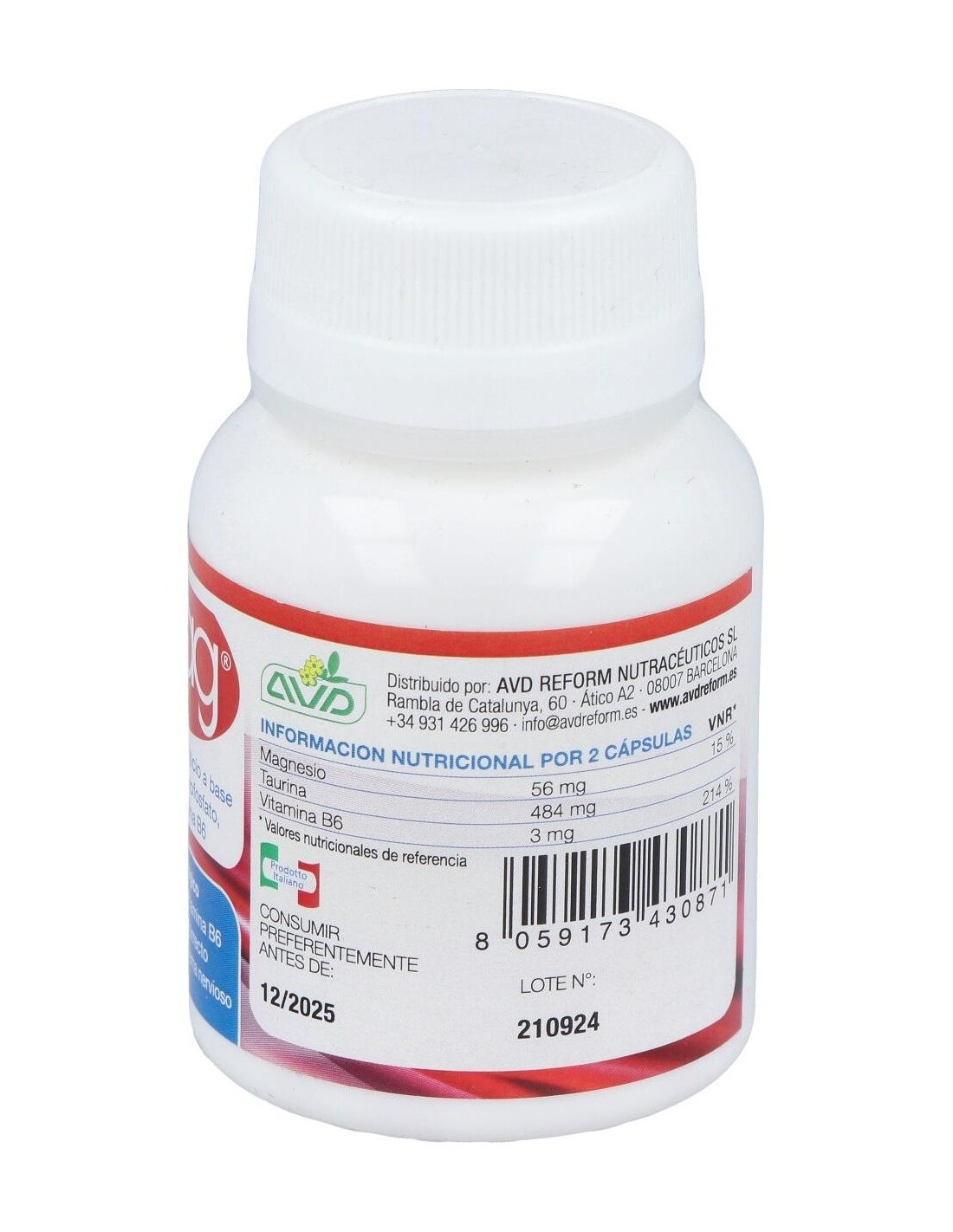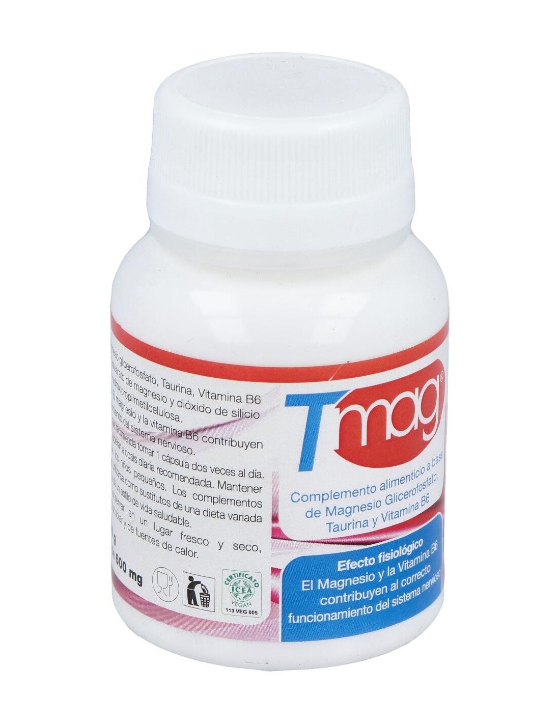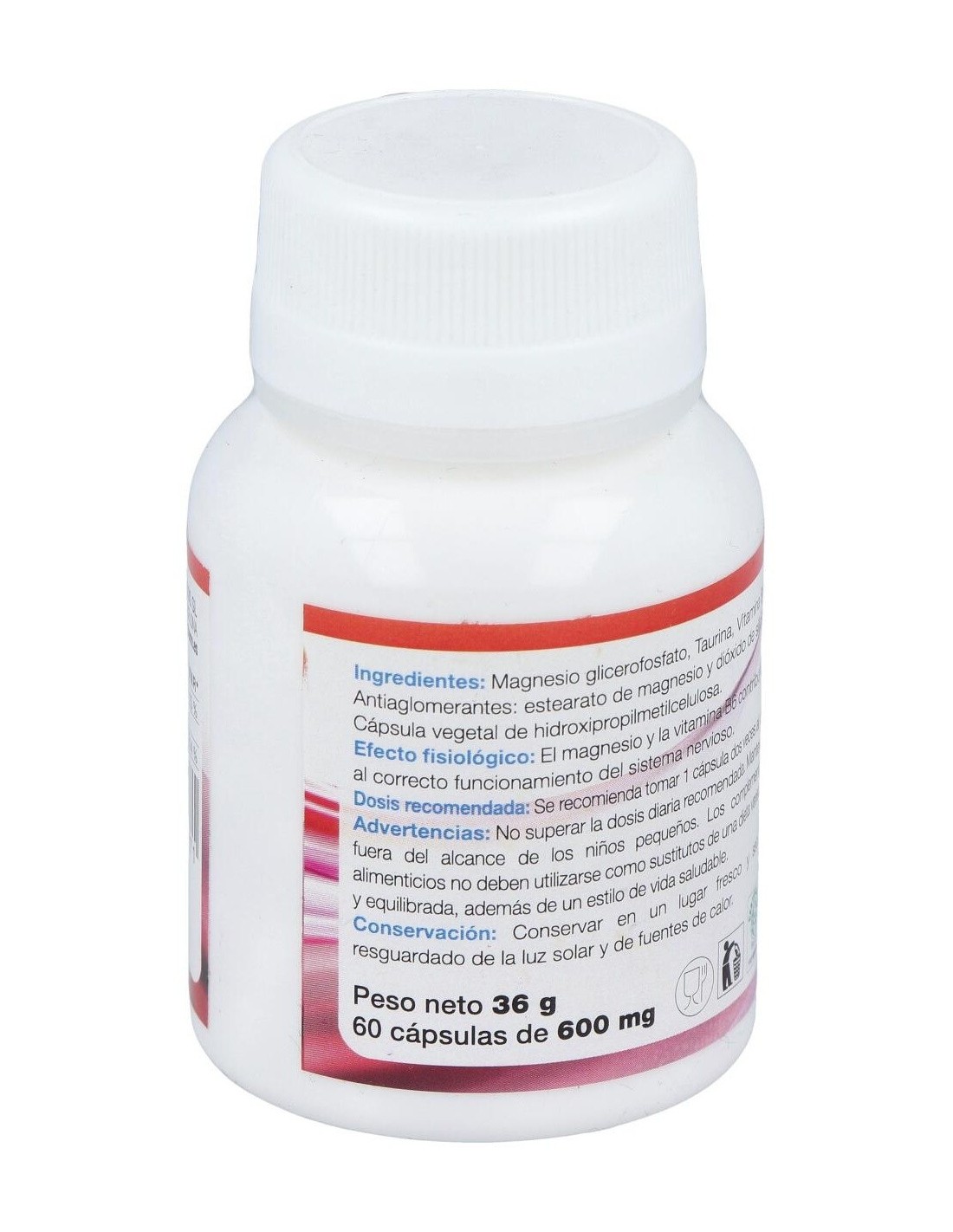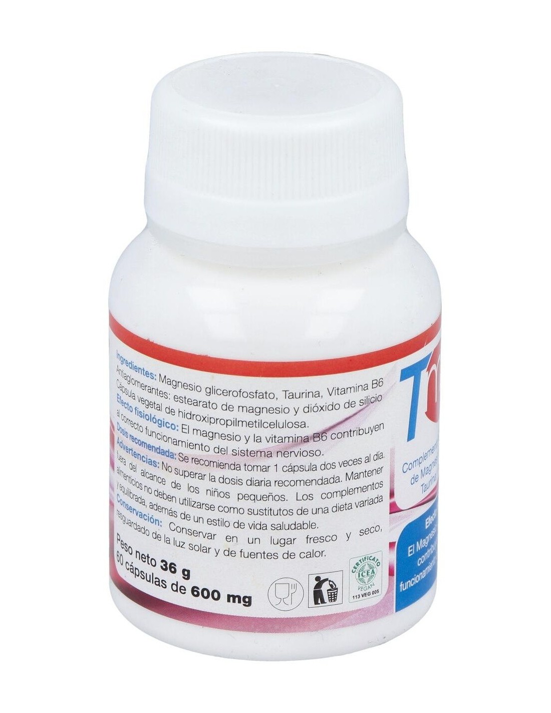 Glicerofosfato de magnesio, Taurina, Vitamina B6, Antiaglomerantes: Estearato de magnesio y dióxido de silicio. Cápsula vegetal de hidroxipropilmetilcelulosa.