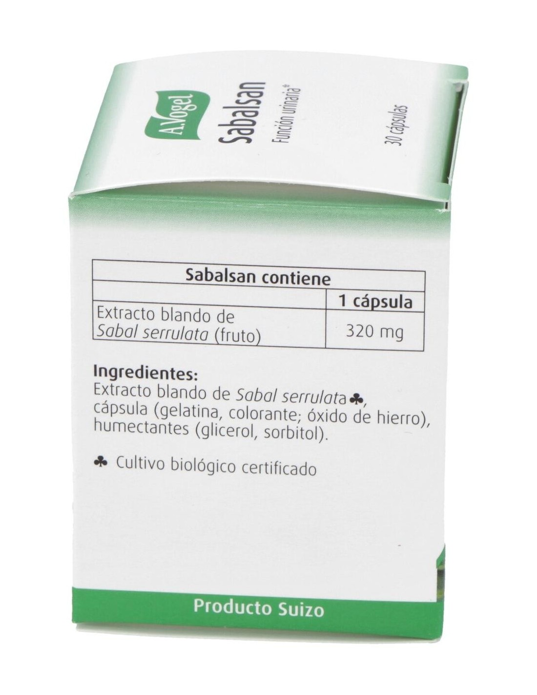 Sabal serrulata fructus extracto concentrado (de cultivo biológico certificado) 320 mg, gelatina, glicerol, solución de sorbitol, colorantes autorizados.