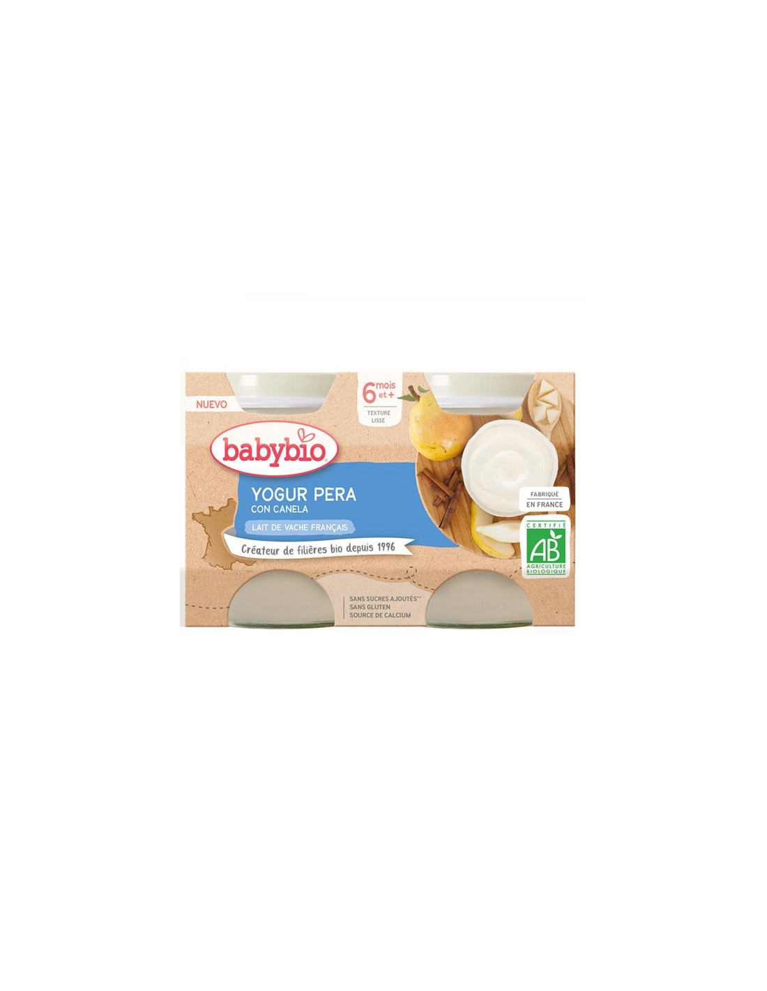 BABYBIOYogur de pera con leche de vaca ecológica. Gran fuente de calcio, con ingredientes procedentes de la agricultura ecológica. Sin gluten. Sin azúcares añadidos.