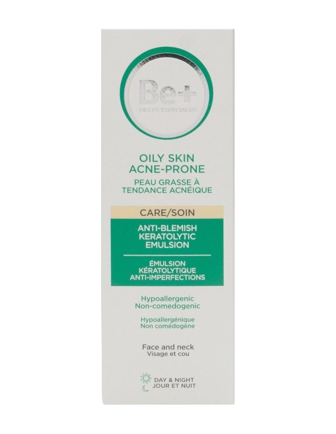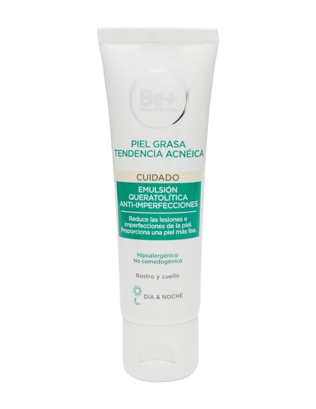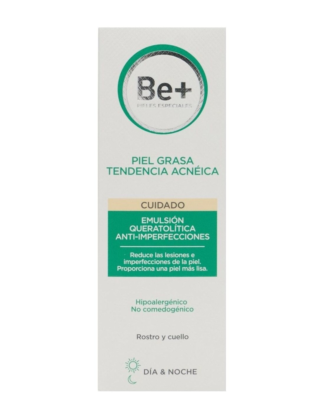 Be+ emulsión queratolítica anti-imperfecciones piel grasa tendencia acneica ayuda a reducir la secreción de sebo, las lesiones inflamatorias y los comedones, a la vez que hidrata y calma la piel. Su fórmula contiene Be+ Skin Barrier Protection, que contribuye a fortalecer la capa protectora de la piel.