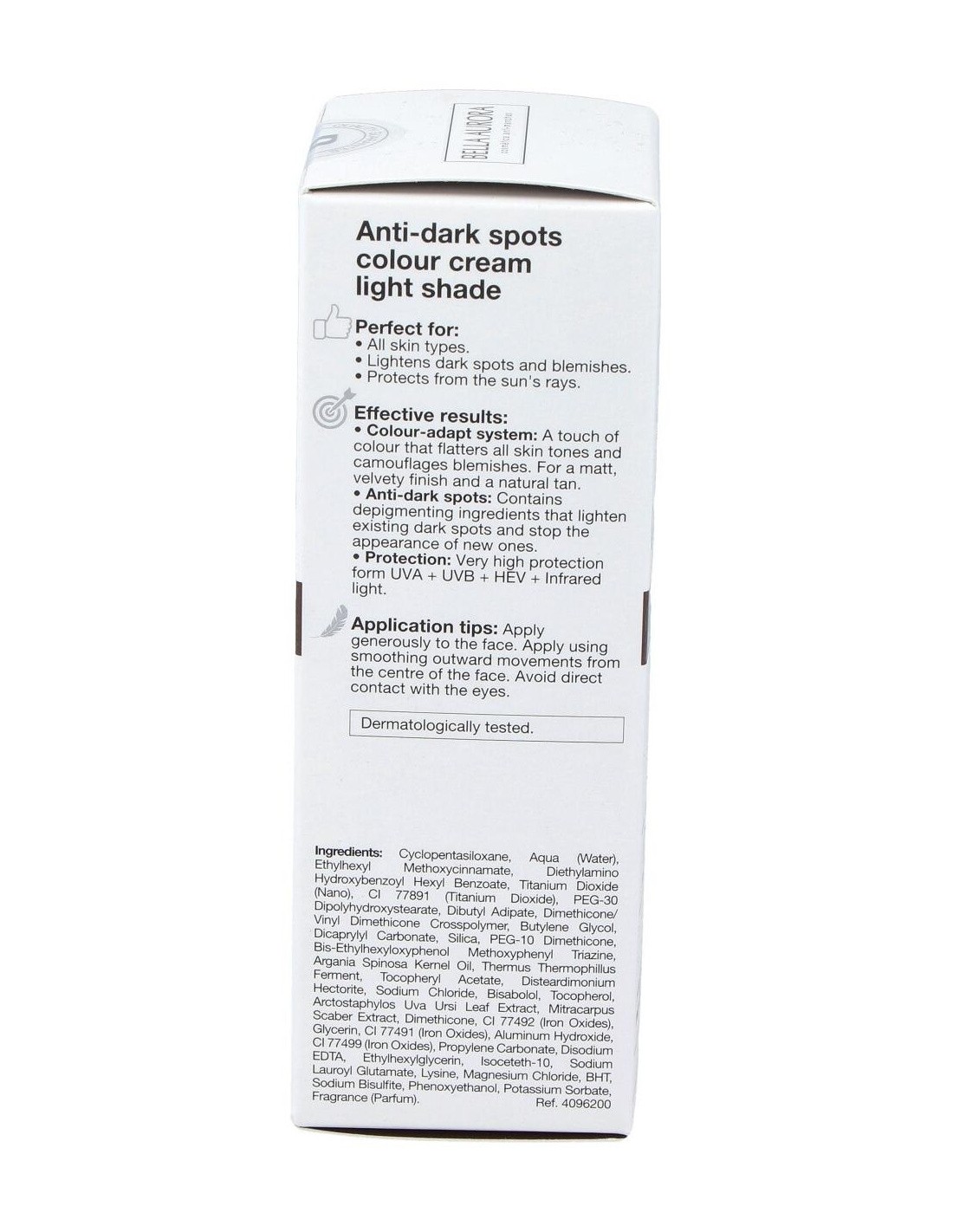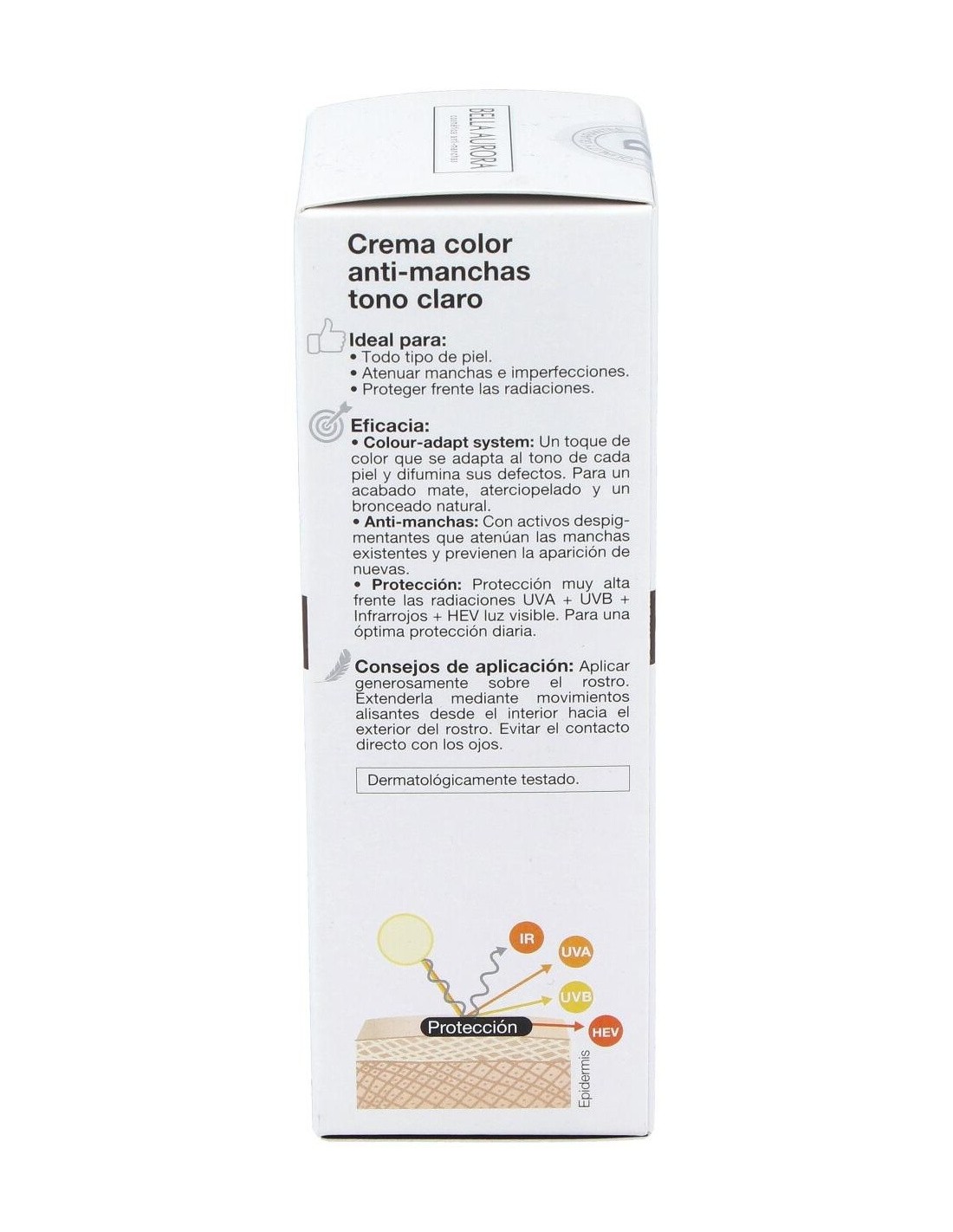 Crema de color anti-manchas con protección muy alta frente las radiaciones UVA, UVB e Infrarrojos. A través de una combinación de filtros de amplio espectro, para una óptima protección diaria. Su formulación incluye activos anti-manchas que atenúan las manchas existentes y previenen la aparición de nuevas, para conseguir una piel uniforme y sin imperfecciones. Protege y repara el ADN de las células dañadas, previniendo el envejecimiento prematuro de la piel. Con color-adapt system, un toque de color que se adapta al tono de cada piel y difumina sus defectos.