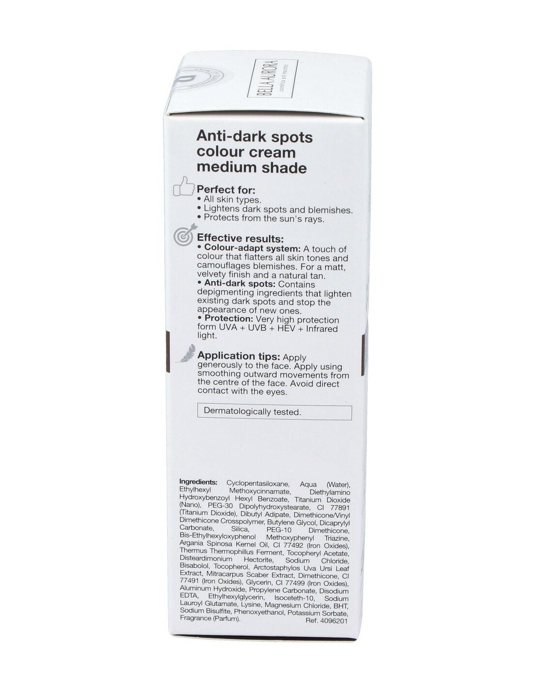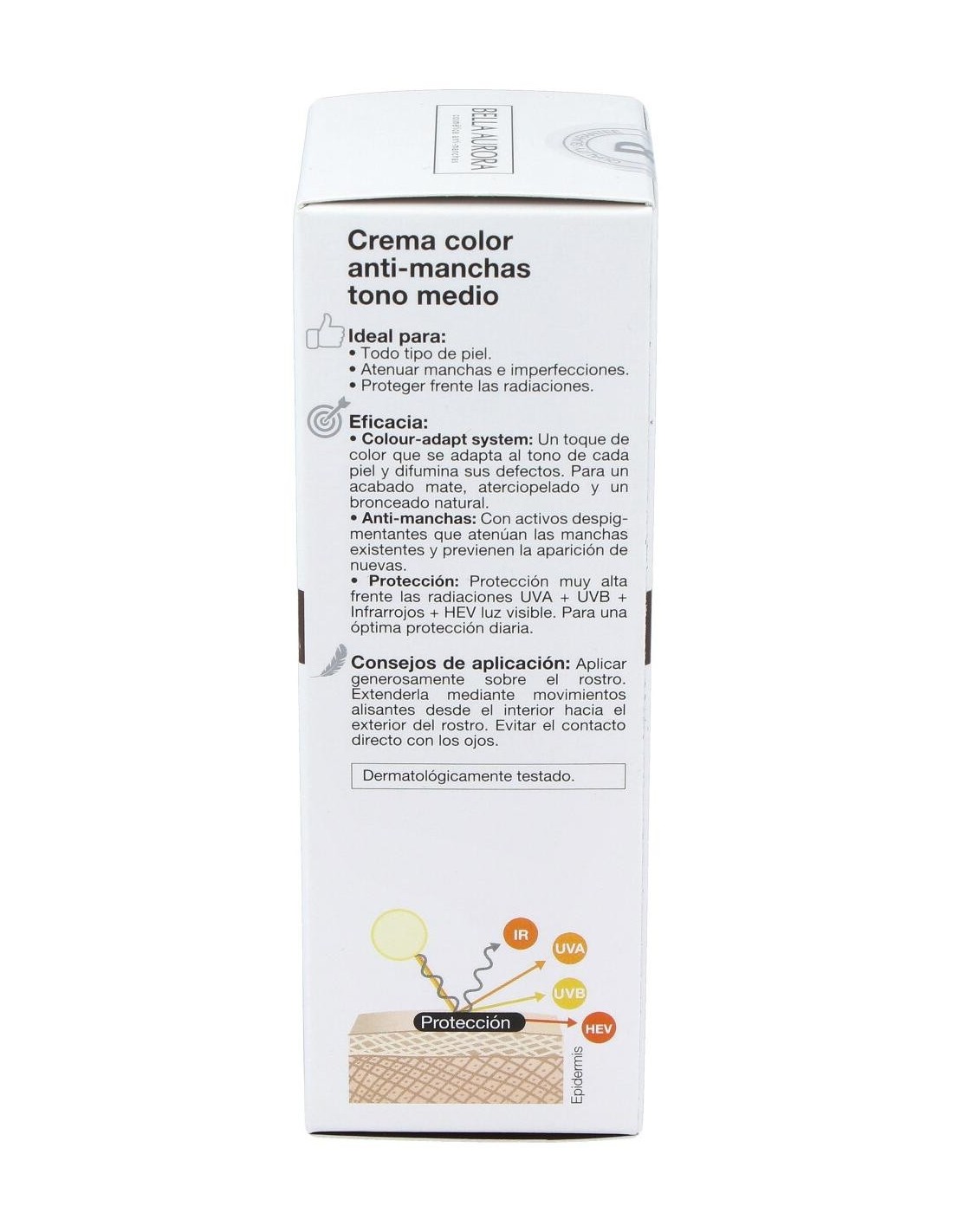 Crema de color anti-manchas con protección muy alta frente las radiaciones UVA, UVB e Infrarrojos. A través de una combinación de filtros de amplio espectro, para una óptima protección diaria. Su formulación incluye activos anti-manchas que atenúan las manchas existentes y previenen la aparición de nuevas, para conseguir una piel uniforme y sin imperfecciones. Protege y repara el ADN de las células dañadas, previniendo el envejecimiento prematuro de la piel. Con color-adapt system, un toque de color que se adapta al tono de cada piel y difumina sus defectos.