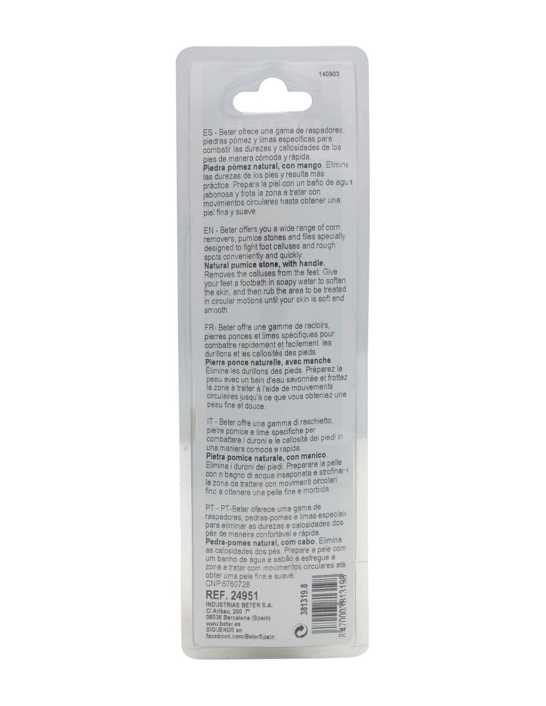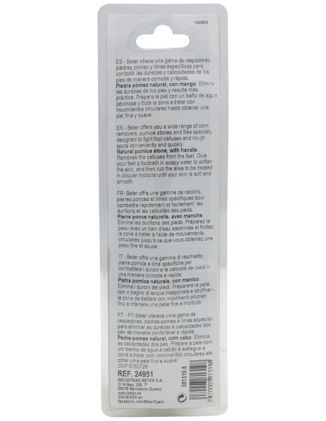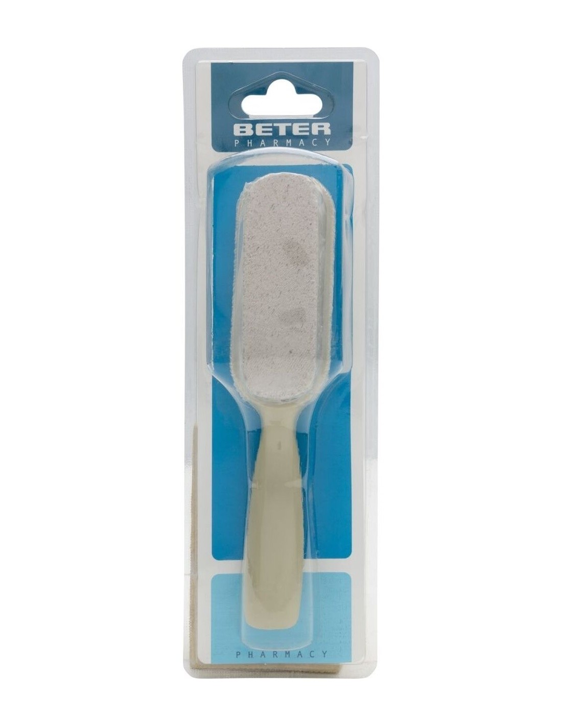 BETER"DescripciónBETER | Beter piedra pómez natural con mango 17cmSeguramente habrás oído hablar de los tratamientos de piedra pómez para las durezas y sequedad de los pies.La piedra pómez natural con mango de Beter reduce de forma rápida y práctica las durezas que se generan en los pies.
