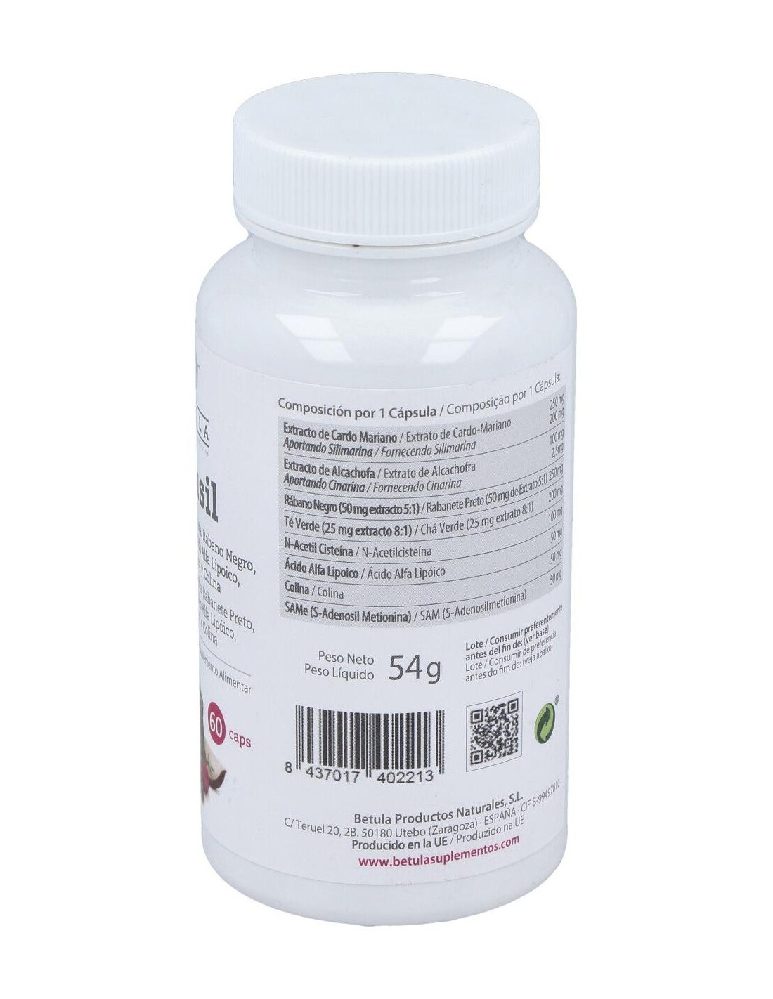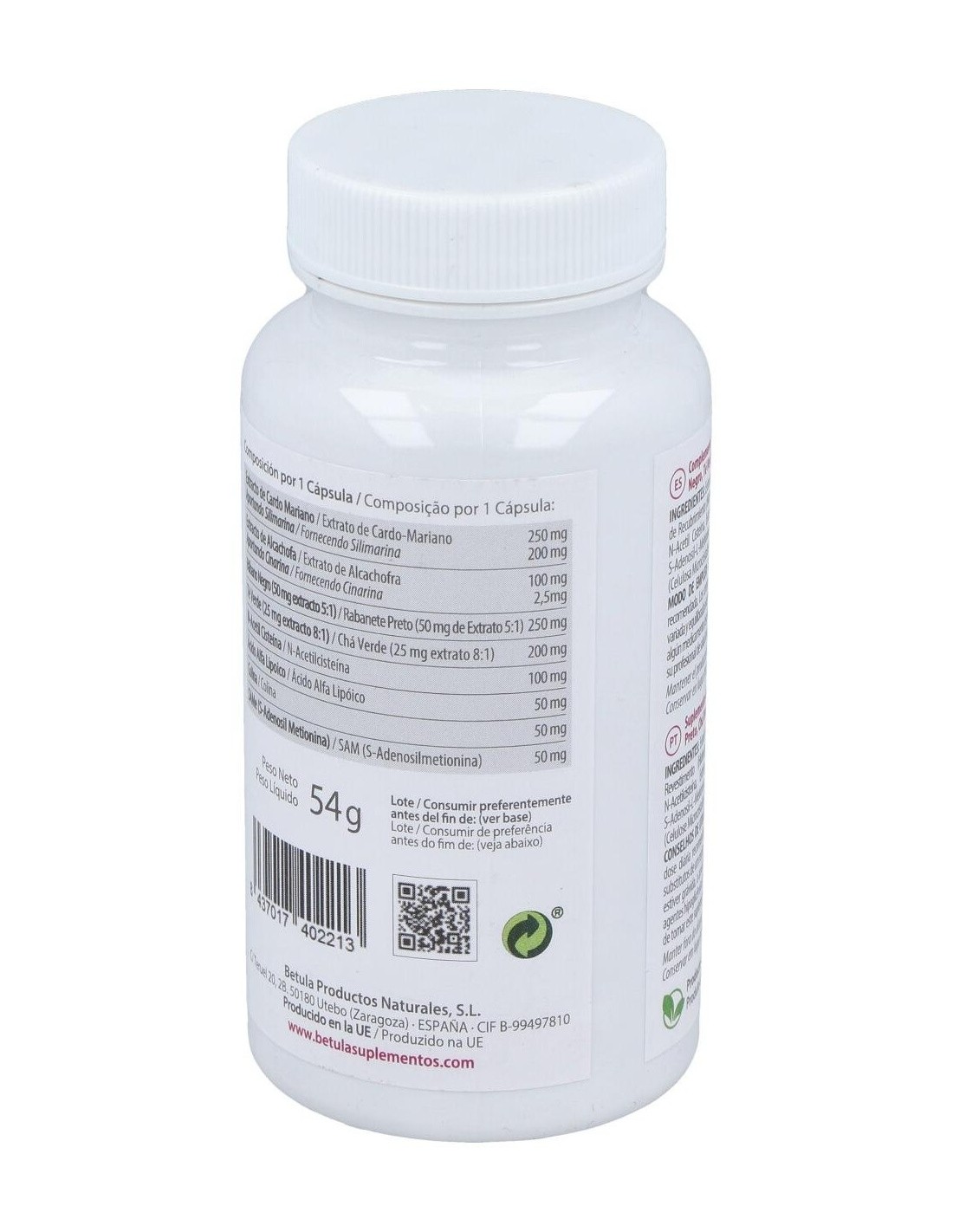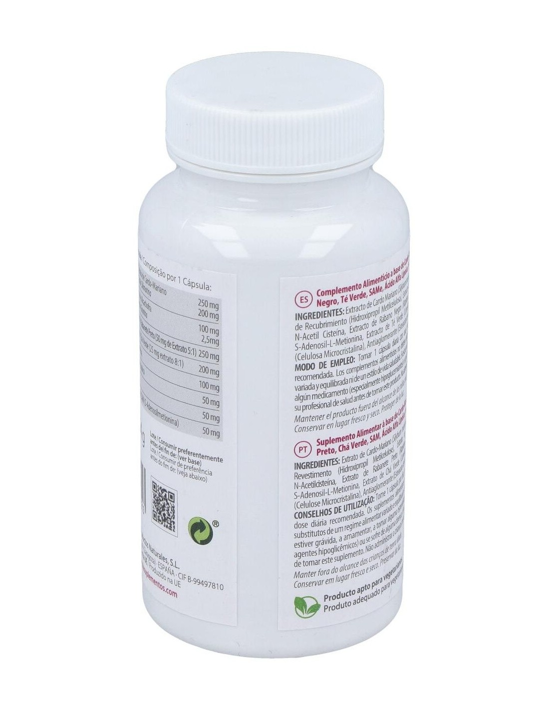 Extracto de Cardo Mariano (Silybum marianum), Citrato de Colina, Agente de Recubrimiento (Hidroxipropil Metilcelulosa), Extracto de Alcachofa (Cynara scolymus), N-Acetil Cisteína, Extracto de Rábano Negro (Raphanus sativus), Ácido Alfa Lipoico, S-Adenosil-L-Metionina, Extracto de Té Verde (Camellia sinensis), Agente de Carga (Celulosa Microcristalina), Antiaglomerante (Estearato de Magnesio).