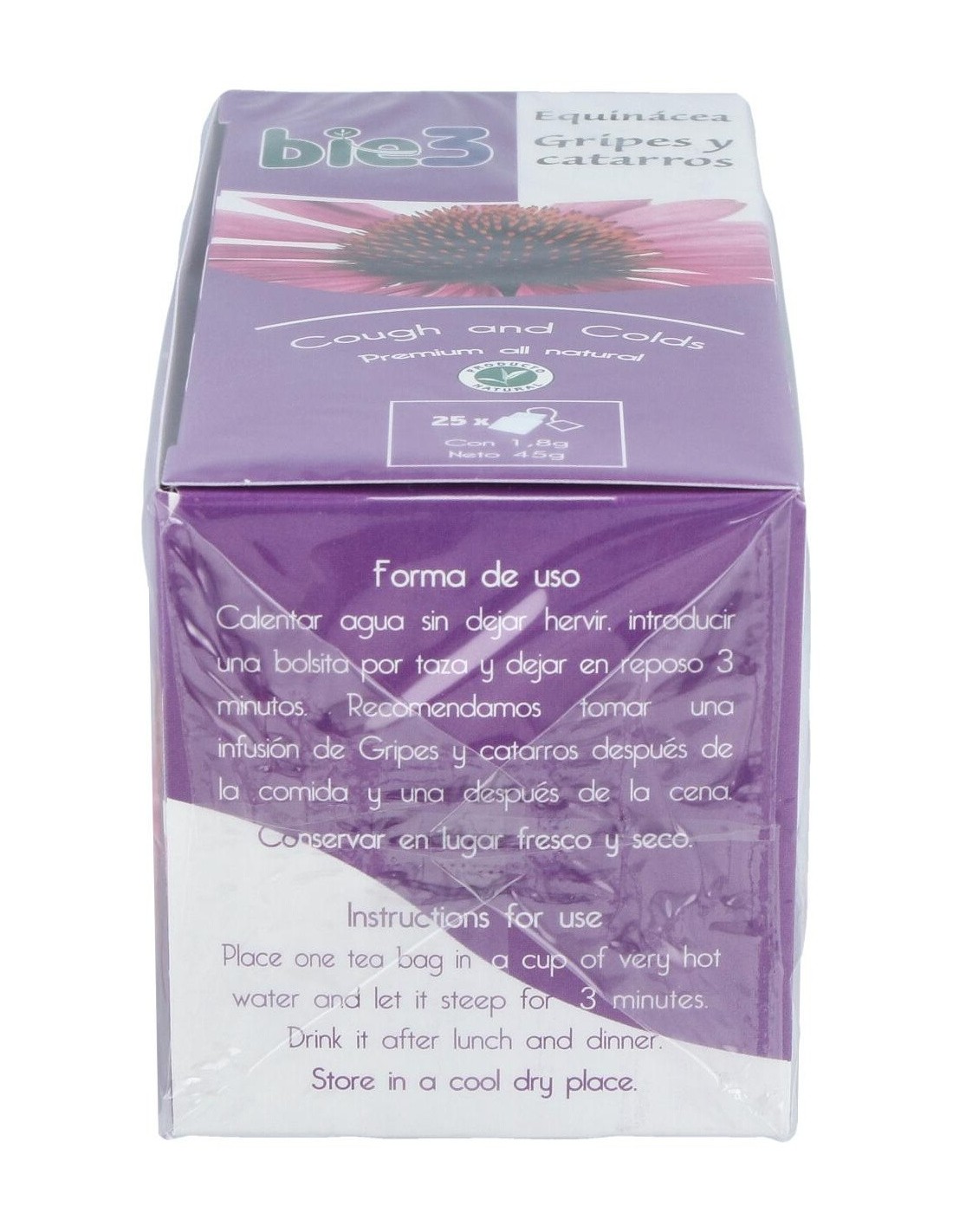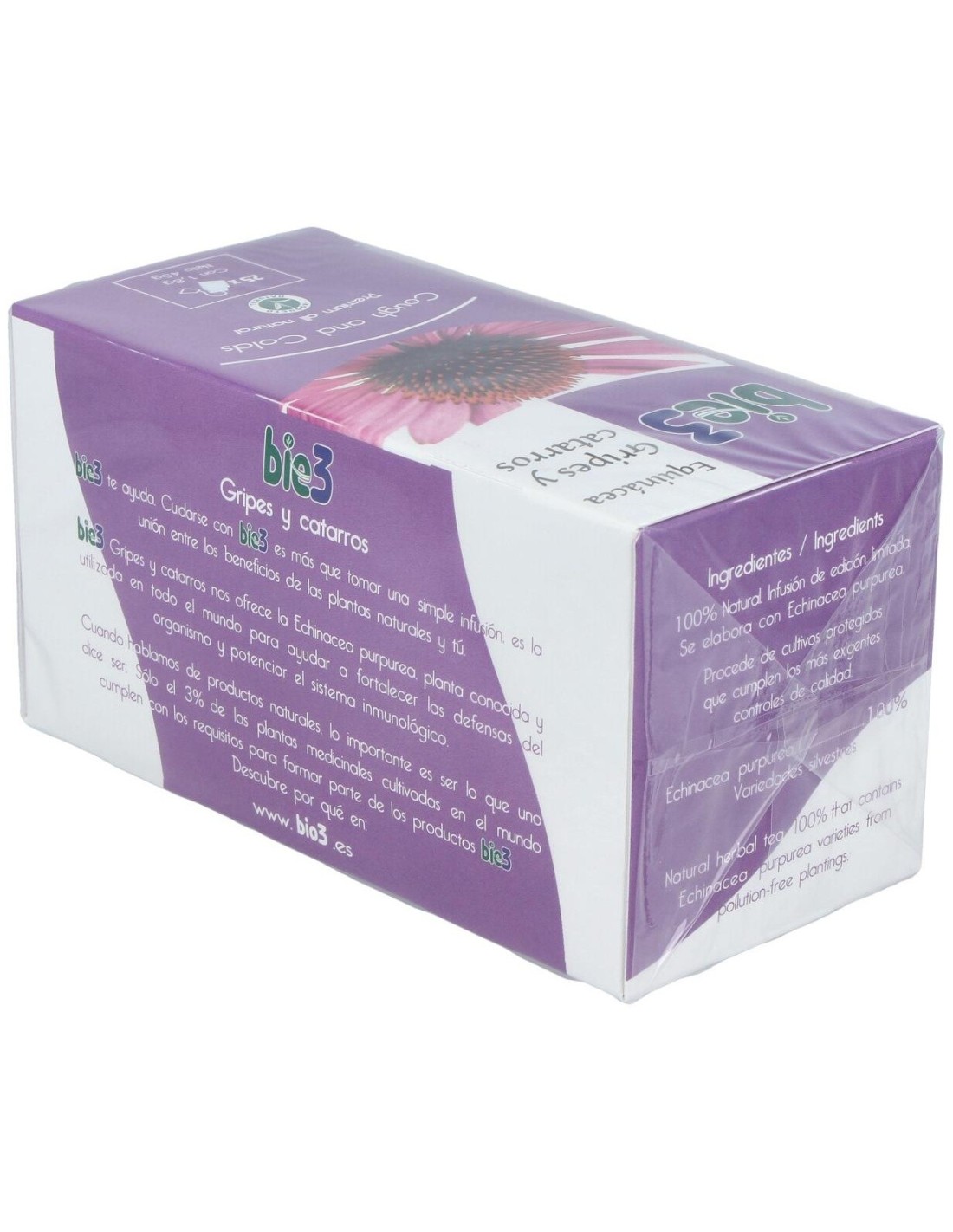 Bie3 echinacea es una infusión preparada para aportar a tu organismo las propiedades naturales del extracto de echinacea, una planta medicinal que ofrece una acción de estimulación sobre el funcionamiento del sistema inmunitario, ayudándole a aumentar las defensas de nuestro organismo. Con un consumo habitual, tu cuerpo se protegerá frente a síndromes gripales, la astenia primaveral y otros procesos infecciosos.
