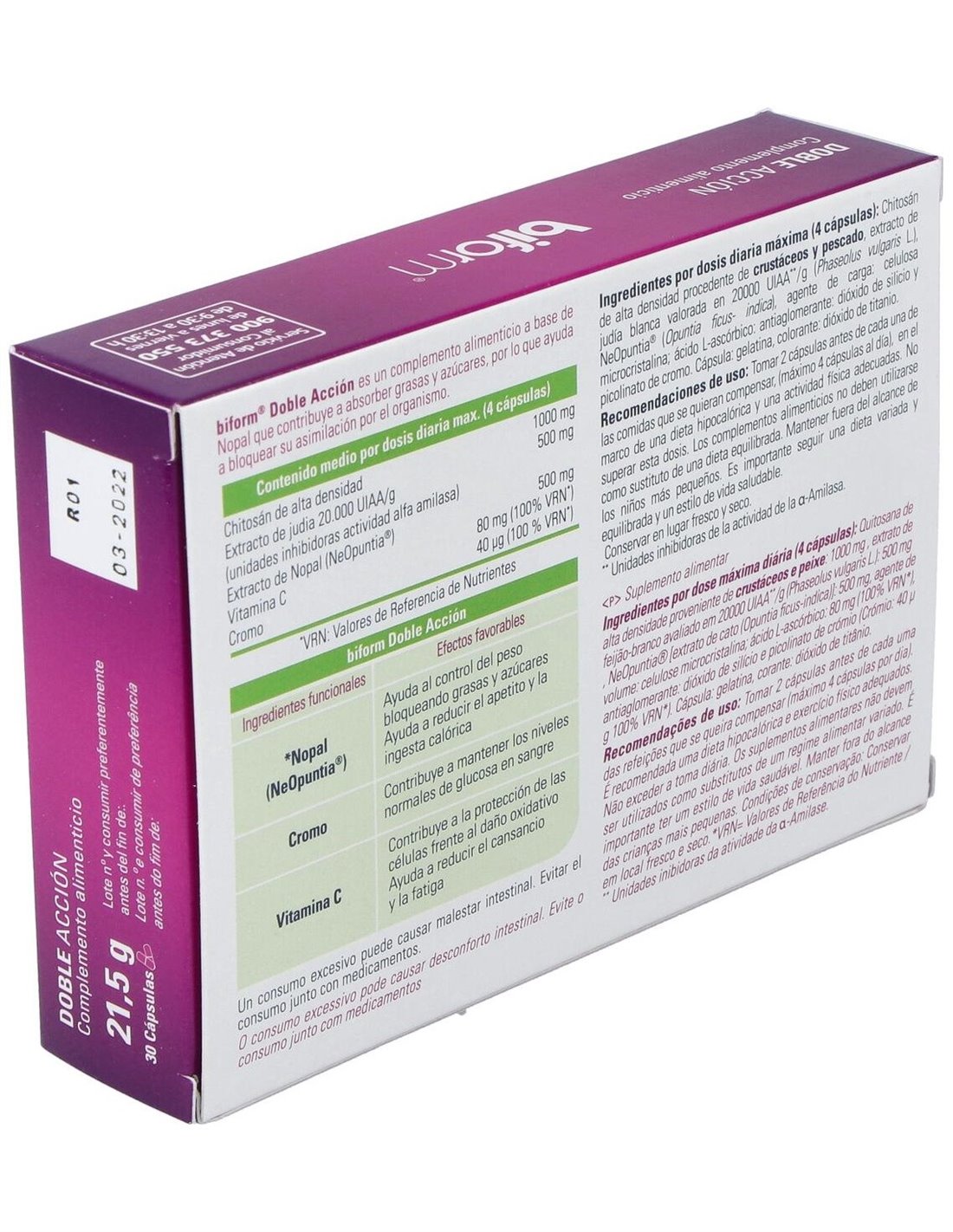 Chitosán de alta densidad procedente de crustáceos: 1000mg, extracto de judía blanca valorado en 20.000 UIAA/g (Phaseolus vulgaris L.): 500 mg, NeOpuntia® (Opuntia ficus-indica) 500mg, agente de carga: celulosa microcristalina, ácido L ascórbico: 80mg , antiaglomerante: dióxido de silicio y picolinato de cromo. (Cromo 40µg ). Cápsula: gelatina, colorante: dióxido de titanio.