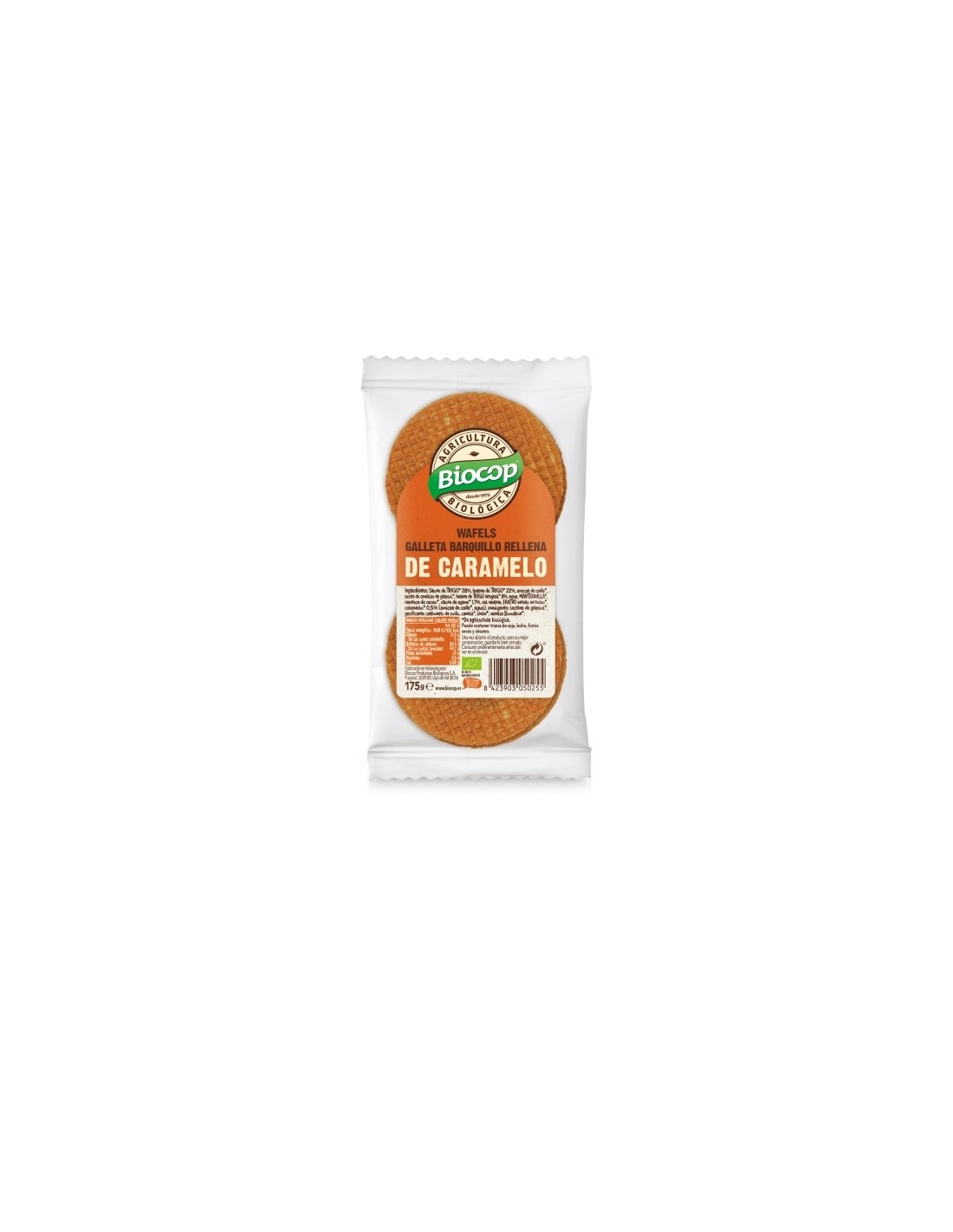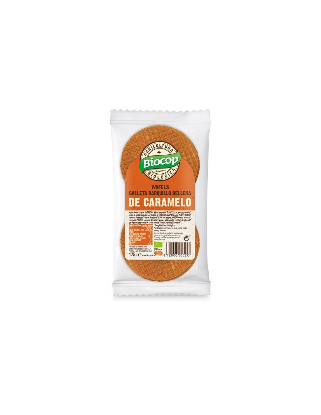Galletas BIOCOP de origen natural en presentación de barquillo tostado y rellenas de caramelo vegano. De apariencia similar a las típicas galletas de origen holandés, este snack tipo waffle es dulce y crujiente. Con un relleno suave y cremoso, pero una cubierta dorada y crocante. Hecha con ingredientes veganos como aceite de semillas de girasol de agricultura biológica, mantequilla y harina de trigo integral.