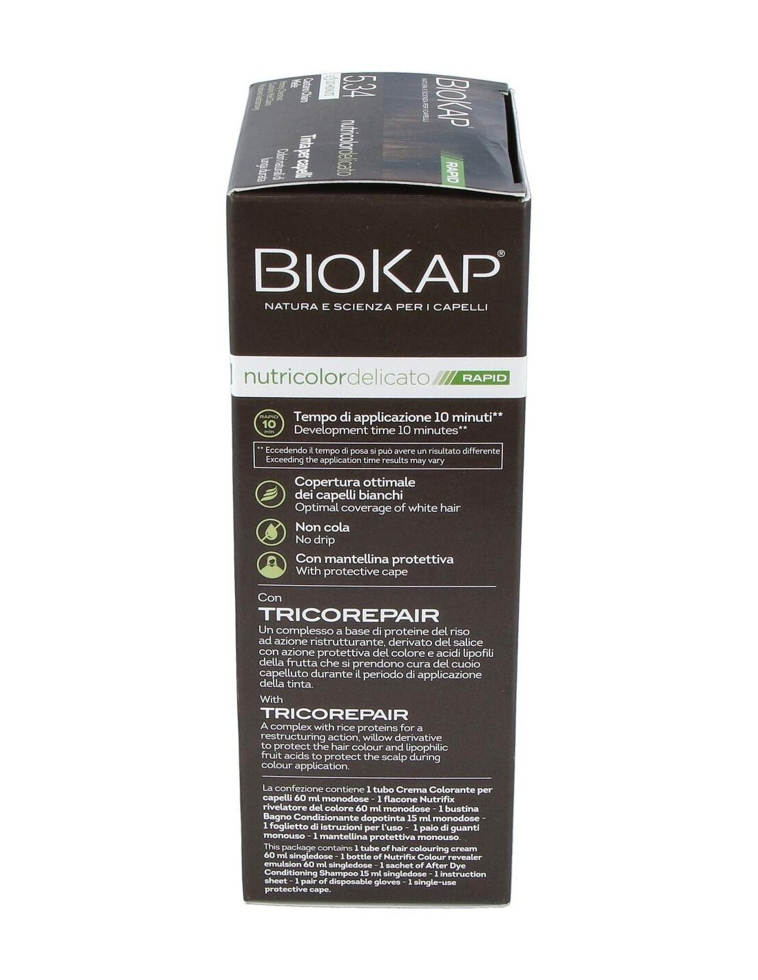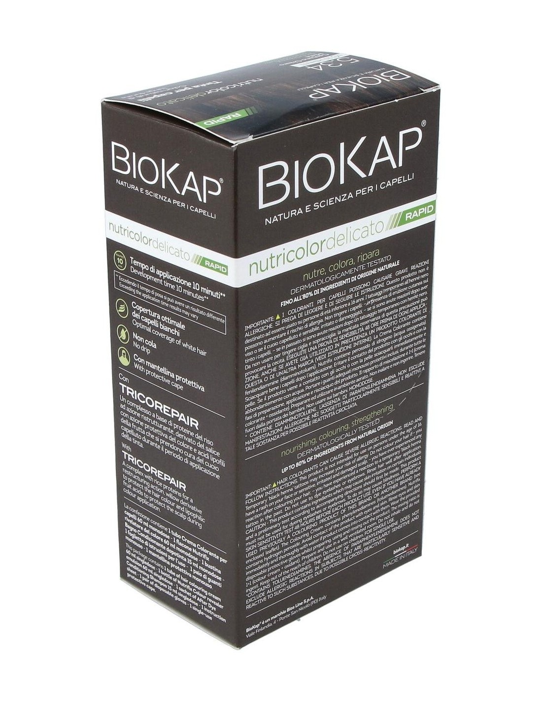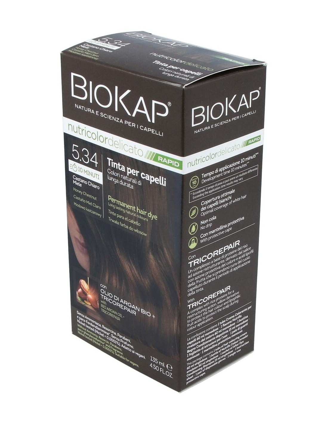 Con una velocidad de obturación de solo 10 minutos debido a su formulación que reduce el tiempo de aplicación del tinte. Se basa en ingredientes vegetales y una alta tolerabilidad de la piel. Nutre y repara el cabello mientras colorea y cubre perfectamente el cabello blanco. Con el complejo TRICOREPAIR a base de proteínas de arroz, derivados de Salice y ácidos lipofílicos de frutas. Enriquecido con aceite de Argán orgánico, nutre el cabello y lo hace más suave y brillante. Sin amoniaco, resorcinol, parabenos, fragancia ni parafenilendiamina. Sin níquel y dermatológicamente probado.