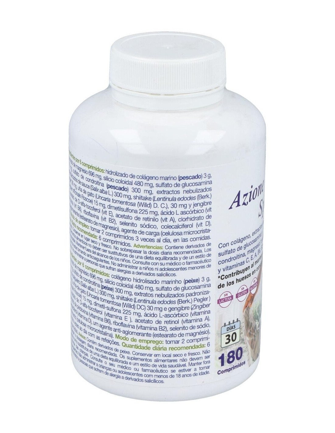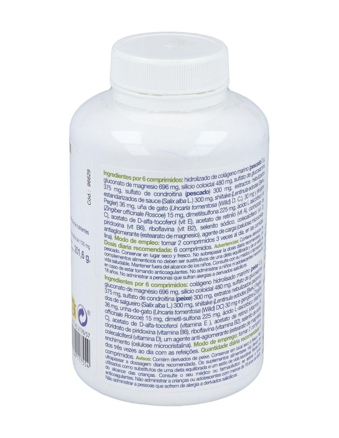 Ingredientes por 6 comprimidos: hidrolizado de colágeno marino 3g, gluconato de magnesio, silicio coloidal 480 mg, sulfato de glucosamina 375 mg, sulfato de condroitina 300 mg, extractos nebulizados estandarizados de sauce (Salix alba L.) 300 mg, shiitake (Lentinula edodes (Berk.) Pegler) 36 mg, uña de gato (Uncaria tomentosa (Willd) D. C.), 30 mg y jengibre (Zingiber officinale Roscoe) 15 mg, dimetilsulfona 225 mg, ácido L ascórbico (vit C), acetato de D-alfa-tocoferol (vit E), acetato de retinilo (vit A), clorhidrato de piridoxina (vit B6), riboflavina (vit B2), selenito sódico, colecalciferol (vit D), antiaglomerante (estearato de magnesio), agente de carga (celulosa microcristalina).
