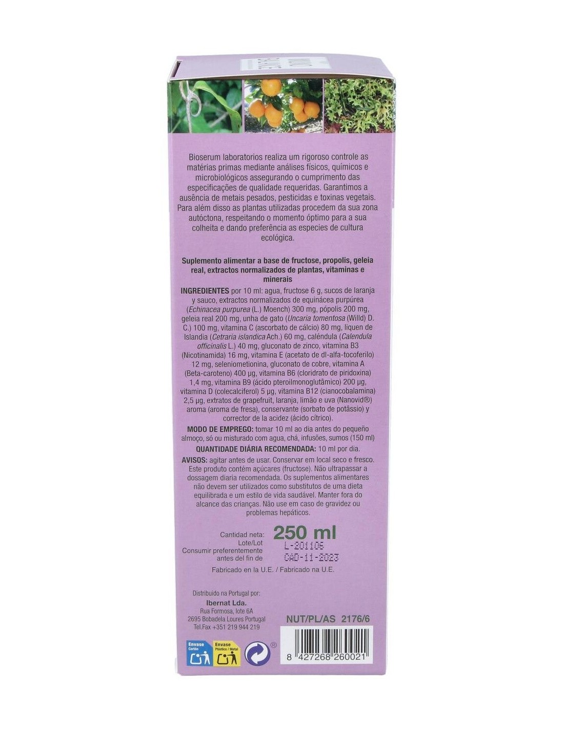 Agua, fructosa, zumos de naranja (Citrus sinensis (L.) Osbeck.) y saúco negro (Sambucus nigra L.), extractos nebulizados estandarizados de equinácea purpúrea (Echinacea purpurea (L.) Moench.) 300 mg, propóleo 200 mg, jalea real 200 mg, gluconato de magnesio, uña de gato (Uncaria tomentosa (Willd) D. C.) 100 mg, vitamina C (ácido l-ascórbico) 80 mg, cetraria (Cetraria islandica Ach.) 60 mg, caléndula (Calendula officinalis L.) 40 mg, gluconato de zinc 30 mg, vitamina B3 (nicotinamida) 16 mg, vitamina E (acetato de dl-alfa-tocoferilo) 12 mg, seleniometionina , gluconato de cobre, vitamina A (beta-caroteno) 800 µg , gluconato de manganeso, vitamina B6 (clorhidrato de piridoxina) 1,4 mg, vitamina B1 (clorhidrato de tiamina) 1,1mg, vitamina B9 (ácido pteroilmonoglutámico) 200 µg, vitamina D (colecalciferol) 5 µg, vitamina B12 (cianocobalamina) 2,5 µg, aroma (aroma de fresa), conservante (sorbato de potasio) y corrector de la acidez (ácido cítrico).