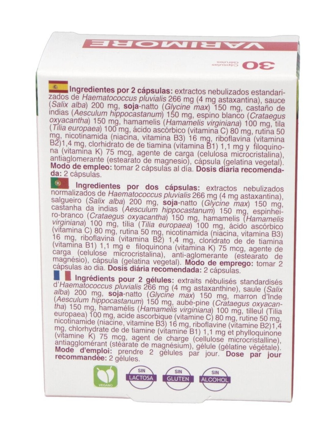 Ingredientes por 2 cápsulas: extractos nebulizados estandarizados de Haematococcus pluvialis 266 mg (4 mg astaxantina), sauce (Salix alba) 200 mg, nattokinasa 150 mg, castaño de indias (Aesculum hippocastanum) 150 mg, espino blanco (Crataegus oxyacantha) 150 mg, hamamelis (Hamamelis virginiana) 100 mg, tila (Tilia europaea) 100 mg, ácido ascórbico (vitamina C) 80 mg, rutina 50 mg, nicotinamida (niacina, vitamina B3) 16 mg, riboflavina (vitamina B2)1,4 mg, clorhidrato de de tiamina (vitamina B1) 1,1 mg y filoquinona (vitamina K) 75 mcg, agente de carga (celulosa microcristalina), antiaglomerante (estearato de magnesio), cápsula (gelatina vegetal).