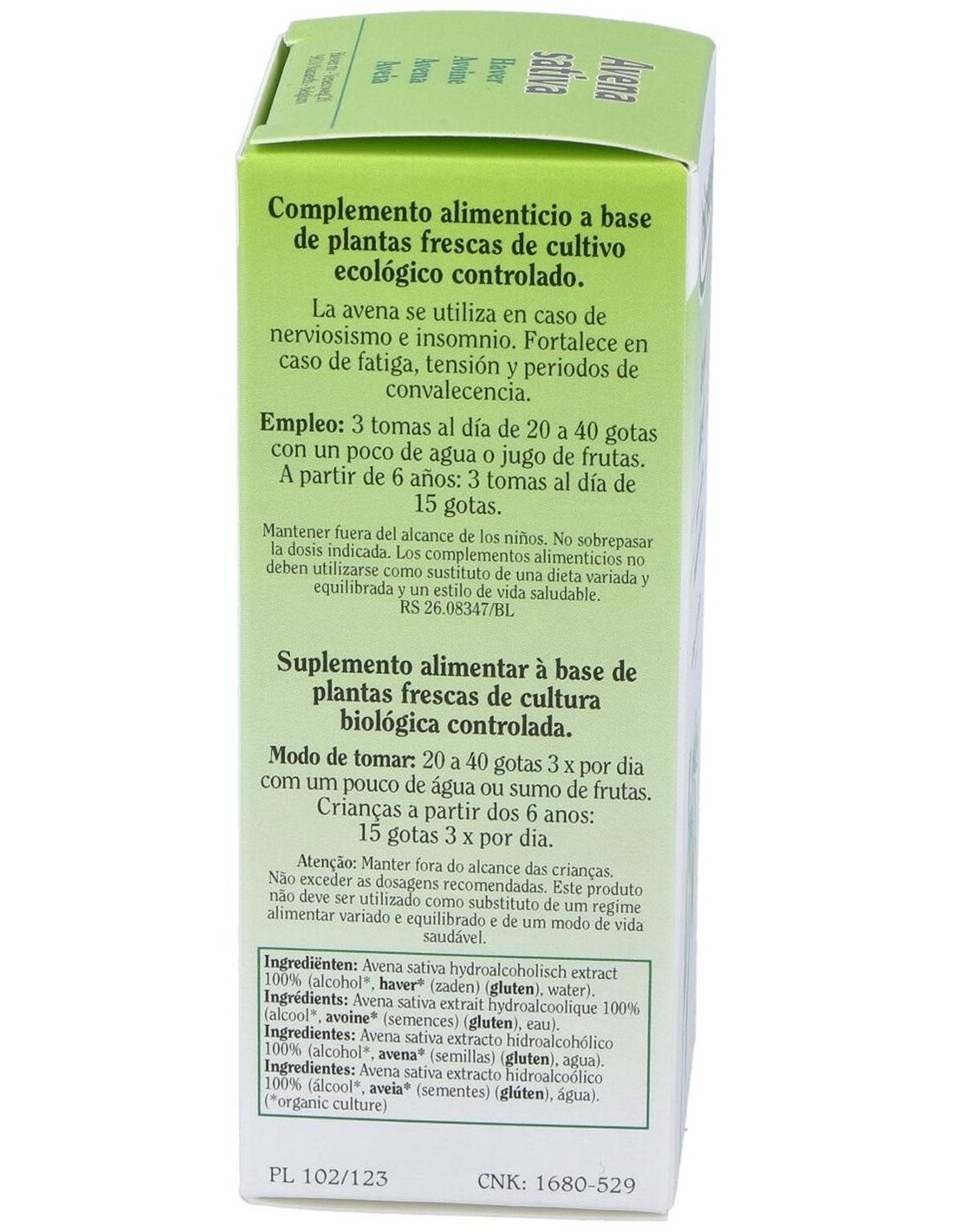 Complemento alimenticio a base de plantas frescas de cultivo ecológico controlado. La avena ayuda a fortalecer en caso de fatiga, tensión y periodos de convalecencia. Se utiliza en caso de nerviosismo e insomnio. No es recomendado para mujeres embarazadas.