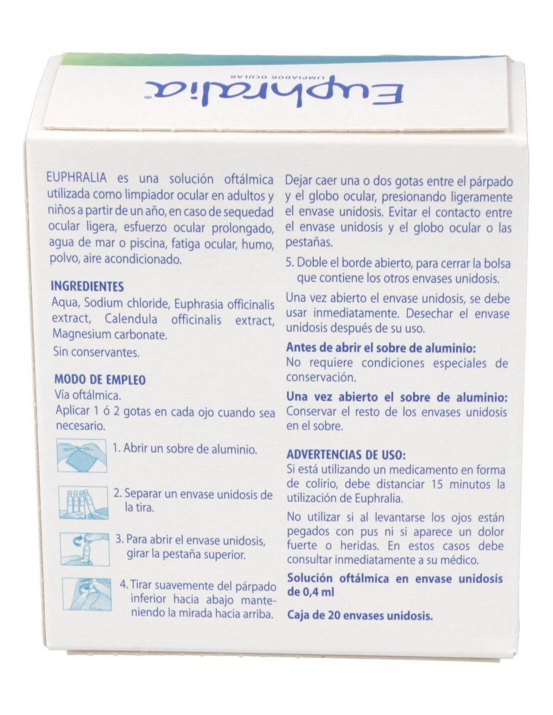 Aqua, Sodium chloride, Euphrasia oficinales extract, Calendula officinalis extract, Carbonato de magnesio.