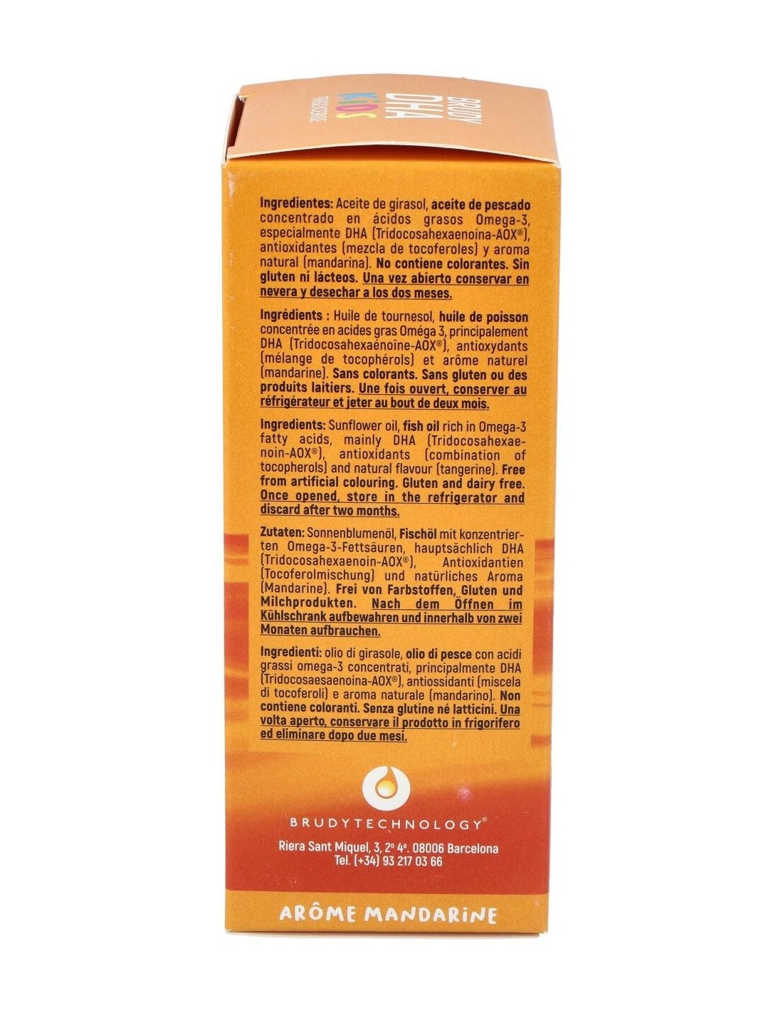Aceite de pescado procedente mayormente de anchoveta peruana concentrado en triglicérido de DHA, aceite de girasol, antioxidante (mezcla de tocoferoles), aroma natural de mandarina.