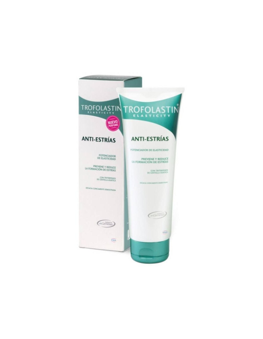 Trofolastín® antiestrías 250ml es una crema antiestrías que ayuda a prevenir su aparición. Su fórmula contiene extracto de centella asiática, que repara la piel y la reafirma; hidrolizado de colágeno e hidrolizado de elastina, que otorgan elasticidad a la piel y contribuyen a su relleno; y aceite de semilla de trigo, que actúa como un emoliente y regenerador cutáneo ante las estrías, además de ser un potente antioxidante.