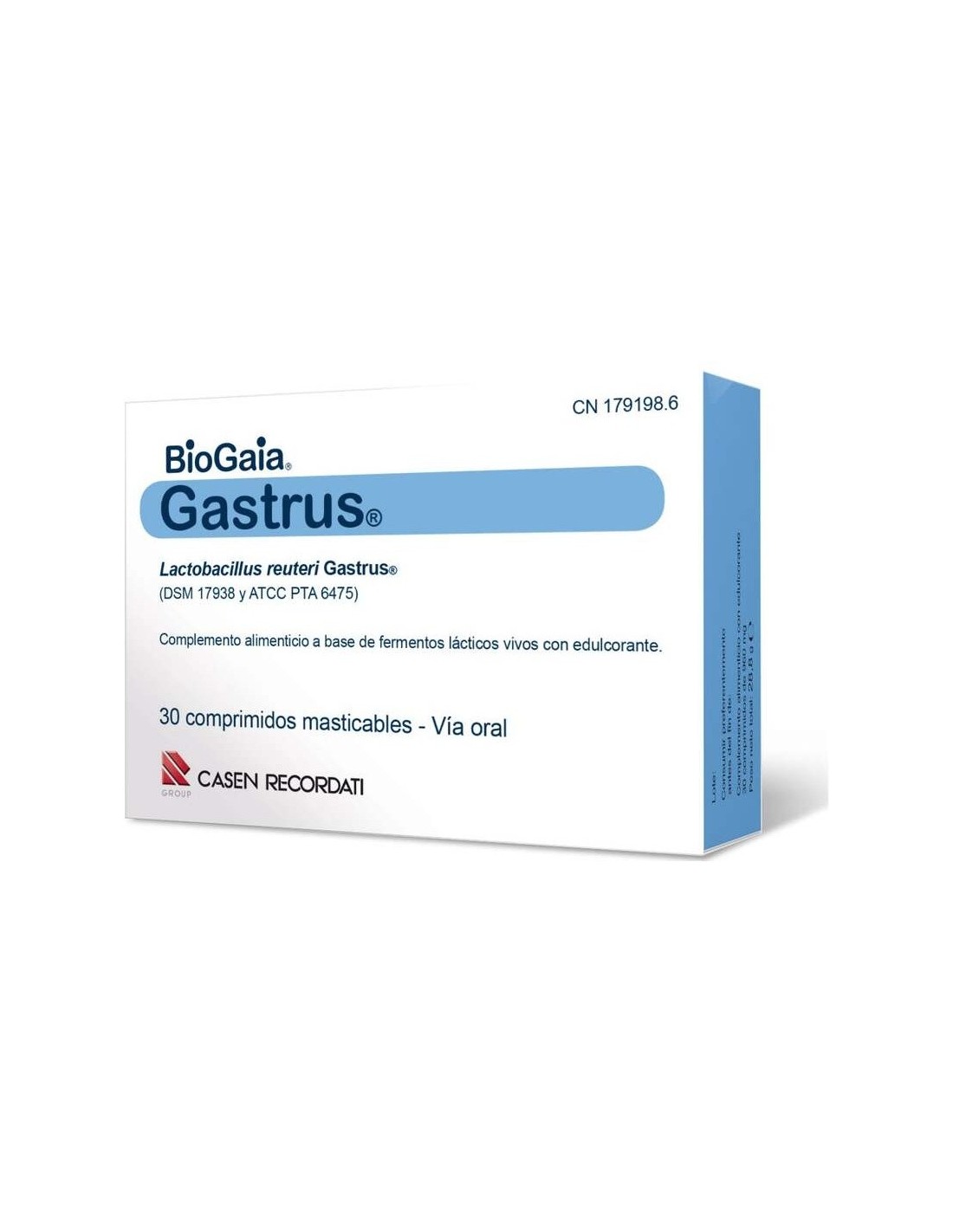 CASENComplemento alimenticio a base de fermentos lácticos vivos procedentes de dos cepas, Lactobacillus reuteri Gastrus® (Lactobacillus reuteri DSM 17938 y Lactobacillus reuteri ATCC PTA 6475), los cuales contribuyen a mantener el sistema digestivo en condiciones normales.