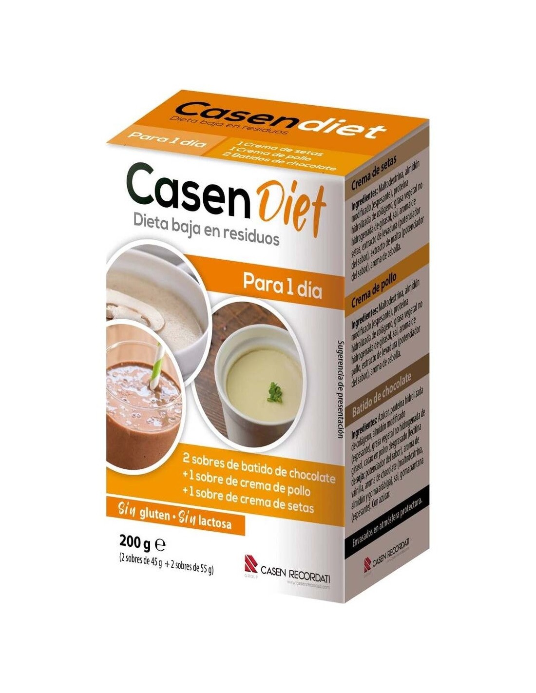 CASENDieta baja en residuos para 1 día. Contiene:\ 2 sobres de batido de chocolate + 1 sobre de crema de pollo + 1 sobre de crema de setas.