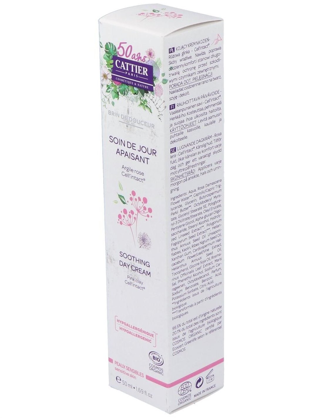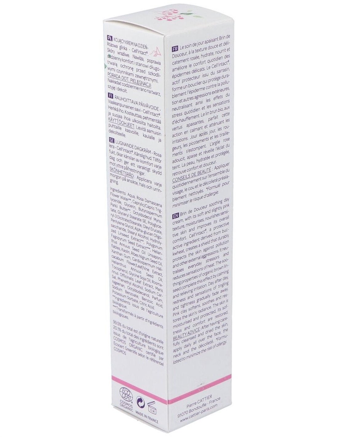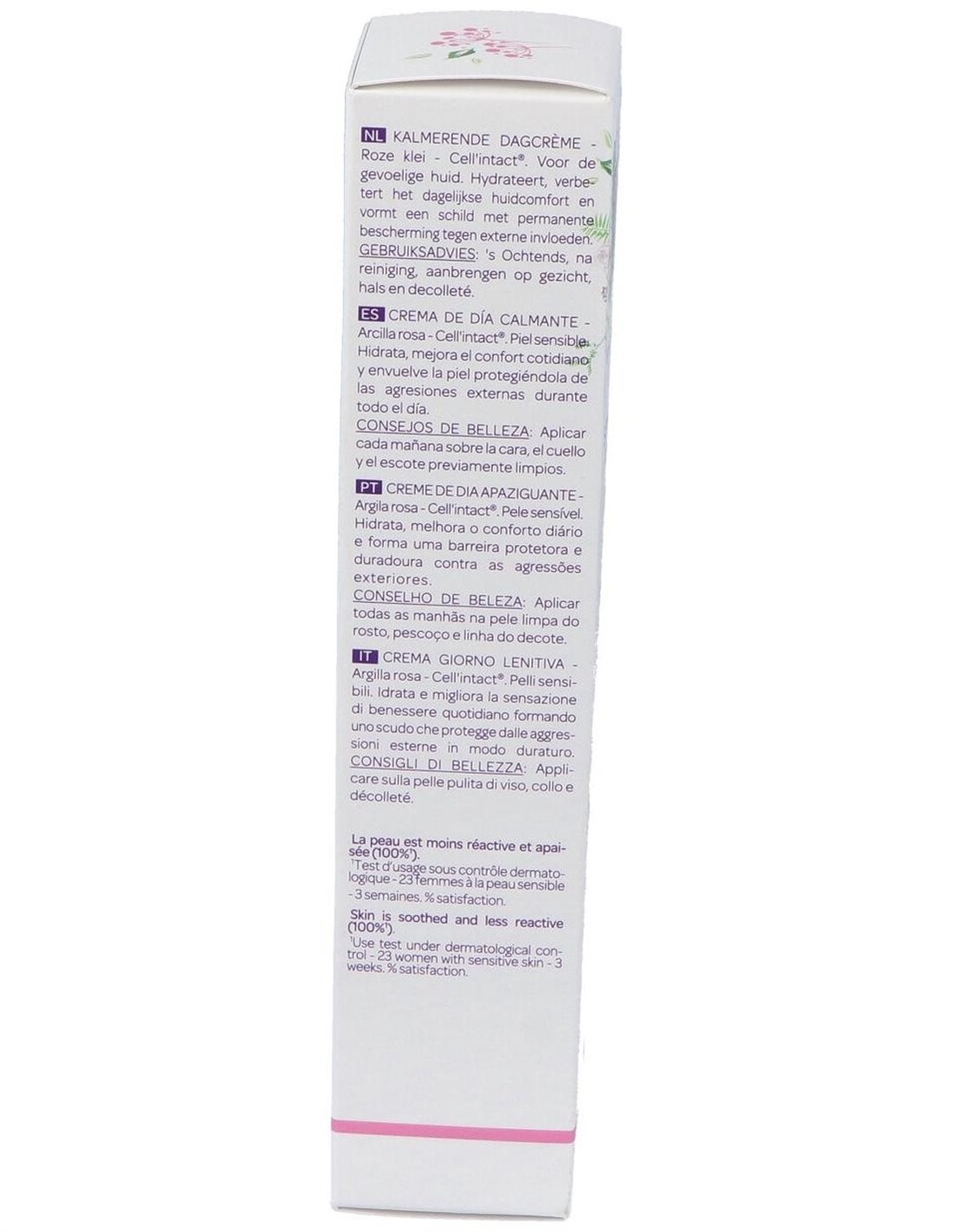 Hidrata y nutre la piel sensible y mejora su confort de forma global. CellIntact®, un ingrediente activo protector derivado del trigo sarraceno, crea un manto protector que protege la piel durante todo el día contra la polución y otras agresiones externas. Neutraliza los agentes que causan estrés a la piel y reduce la sensación de ardor. Las propiedades calmantes de la semilla de lino marrón ecológica completan el efecto calmando y aliviando las irritaciones. Día a día, las rojeces y la sensación de hormigueo y tirantez desaparecen gradualmente. La arcilla rosa suaviza, calma y devuelve a la piel su resplandor. La piel queda hidratada y protegida, y recupera la suavidad y la sensación de confort.