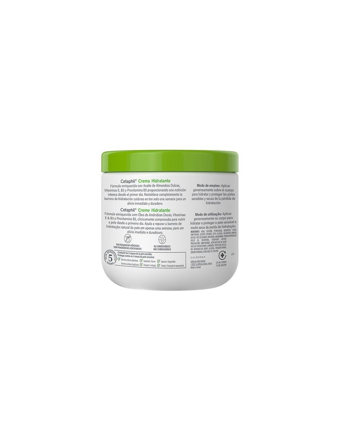 CETAPHILPara pieles sensibles, secas y muy secas. Está clínicamente probado que la crema enriquecida proporciona una hidratación intensa y duradera durante 48 horas. Especialmente formulada con una mezcla respaldada por dermatólogos de Niacinamida (vitamina B3), Pantenol (Provitamina B5) y Aceite de Almendras Dulces para ayudar a mejorar la resistencia de la piel sensibles. Mejora significativamente la barrera cutánea, con un restablecimiento completo en una semana. Testada por dermatólogos y clínicamente probada para ser suave con la piel sensible.