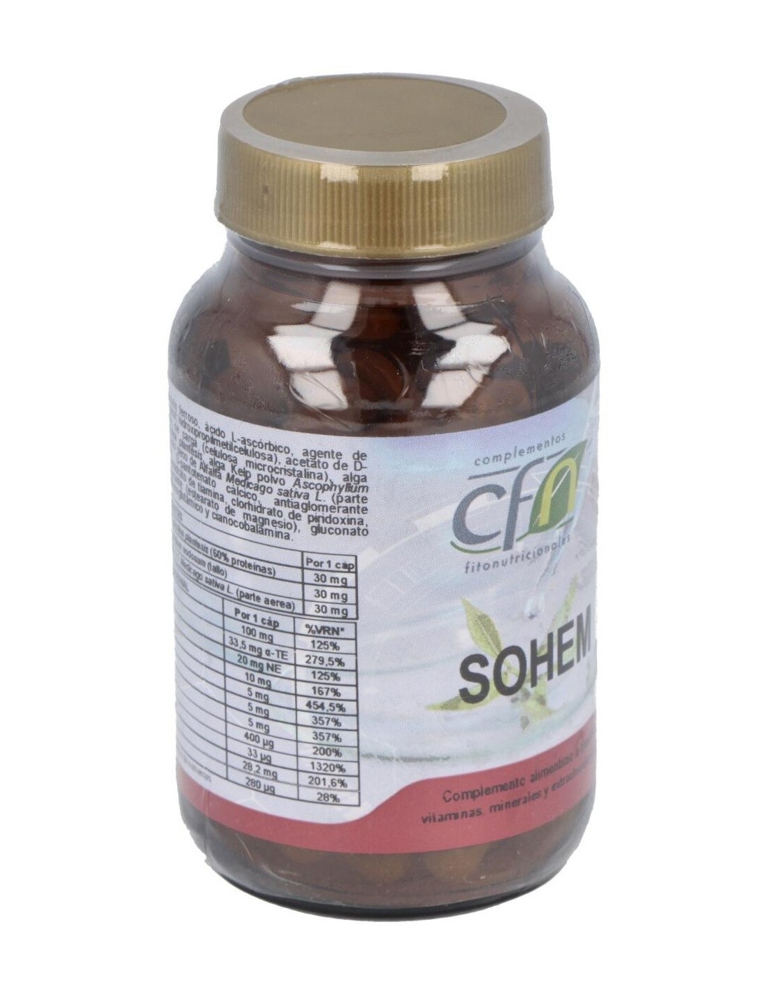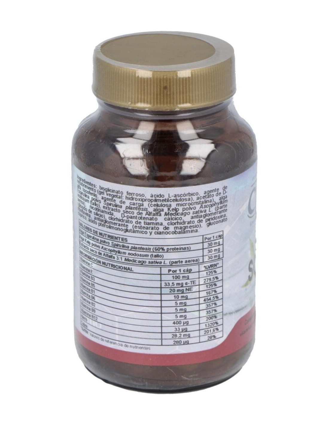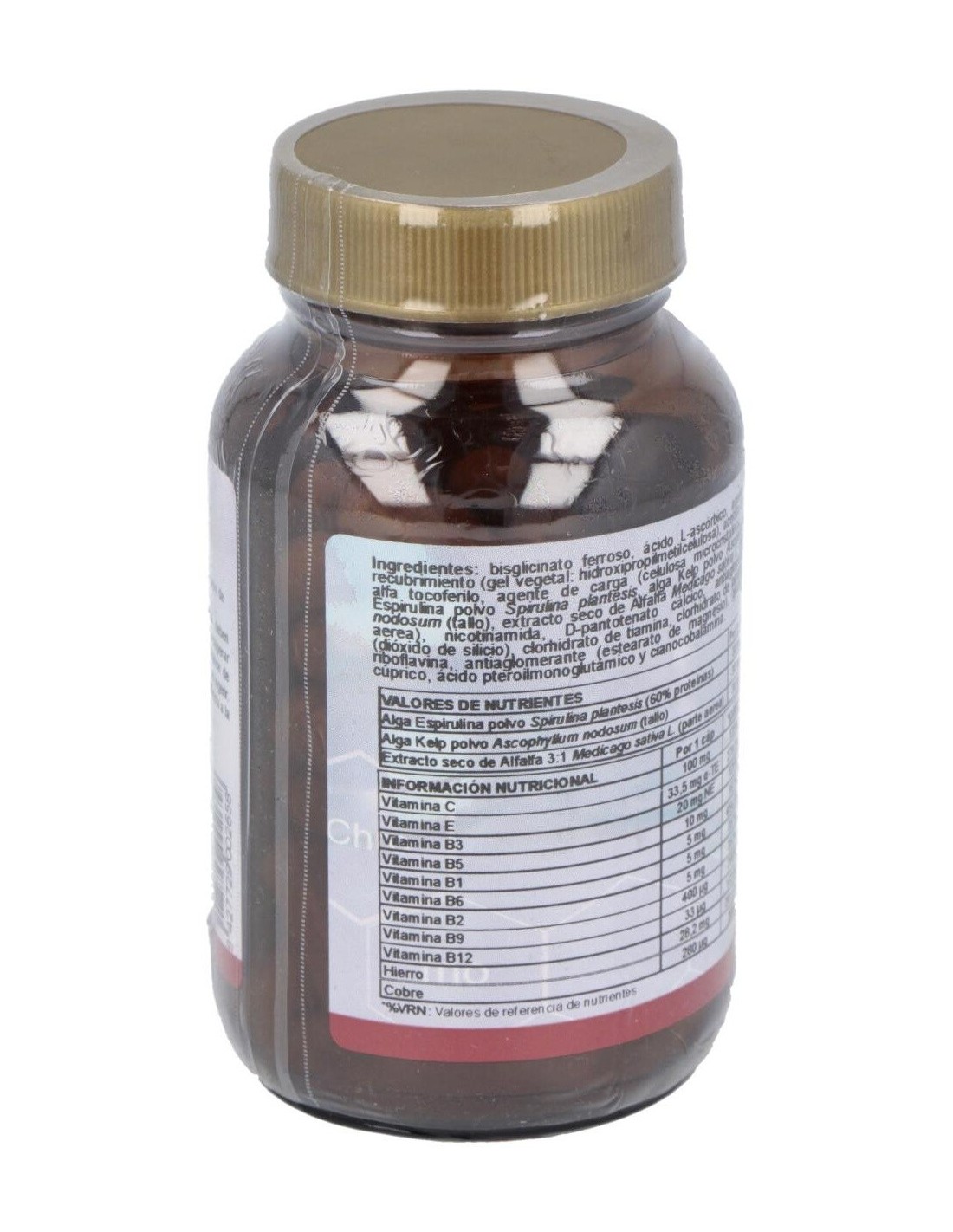 Por 1 cápsula: Ácido fólico (800 µg), Vitamina C (100 mg), Vitamina B12 (100 µg), Vitamina E (50 mg), Extracto de alfalfa (30 mg), Algas Kelp (30 mg), Hierro aminoquelado (30 mg), Espirulina máxima (30 mg), Vitamina B3 (20 mg), Vitamina B5 (10 mg), Vitamina B1 (5 mg), Vitamina B6 (5 mg), Vitamina B2 (5 mg), Cobre aminoquelado (1 mg).